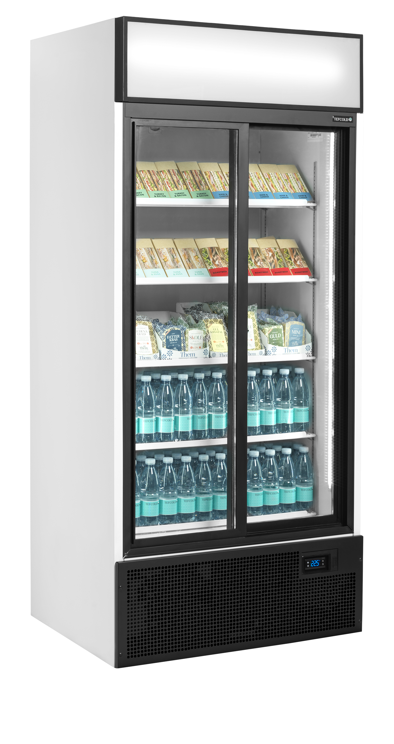 Řada TEFCOLD FSC dvoudveřových a třídveřových chladicích skříní s osvětleným reklamním panelem nabízí vysokou kvalitu provedení za příznivou cenu. Vyberte si mezi chladicími skříněmi v bílém nebo černém provedení s černými prosklenými dveřmi s hliníkovým rámem. Dveře máme v nabídce křídlové (H) nebo posuvné (S). Police jsou nastavitelné, řada FSC tak představuje flexibilní řešení pro prezentaci vašeho prodávaného zboží. Získáte skvělou možnost prezentace výrobků v kombinaci s výkonným systémem ventilovaného chlazení řízeným elektronickým termostatem. Mnoho modelů je také k dispozici bez reklamního panelu (řada FS).