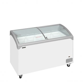 Pultová mraznička s proskleným oblým víkem, bílý exteriér, bílý interiér, šedý rám NIC 401 SCEB