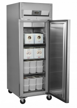 Řada RF-X mrazicích skříní s 1 nebo 2 plnými dveřmi je určena pro profesionální kuchyně a disponuje nastavitelnými policemi. Mrazicí skříň je vyrobena z vysoce kvalitní nerezové oceli SS304 vhodné pro gastronomii a má odolná kolečka pro snadné přemísťování. Chlazení s ventilací zajišťuje optimální teplotu, kterou lze nastavit na digitálním termostatu. Funkce Bluetooth umožňuje snadné monitorování prostřednictvím aplikace. Nožičky na objednávku.