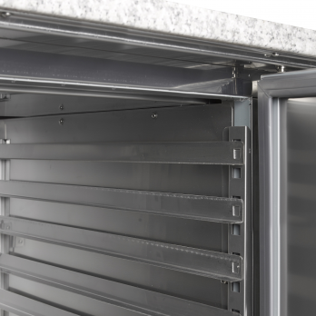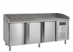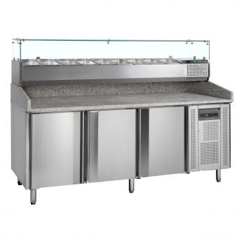 Řada PT chladicích pizza stolů je vyrobena z nerezové oceli SS304. Má žulovou desku, která je pro přípravu pizzy ideální, protože žula zůstává chladná a těsto se na ni méně lepí. Stoly jsou k dispozici v několika velikostech se 2 nebo 3 dvířky. Také je možné pořídit si přizpůsobenou variantu se zásuvkami 1/2+1/2 (kód 12526). Chladicí pizza stoly mohou být dodávány buď v kompletu s chladicí nástavbou pro GN 1/3 x 150 mm (nejsou součástí), nebo samostatně bez nástavby.