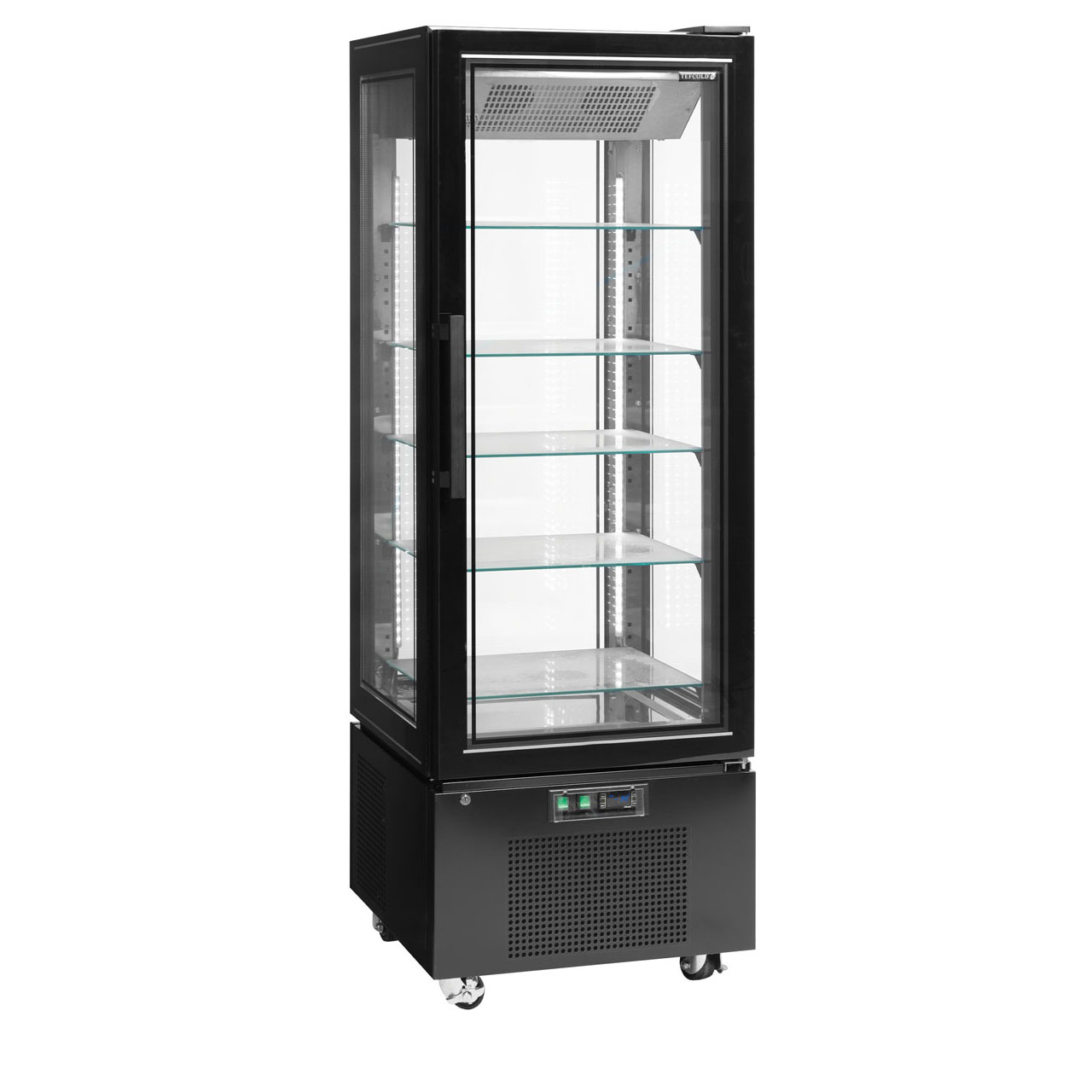 Mrazicí vitrína TEFCOLD UPD 400 F Black má všechny čtyři strany prosklené s dvojitým izolačním sklem, což zajišťuje vynikající prezentaci vystavených produktů. Má také bezrámové dveře s vyhřívaným rámem. Výšku mezi skleněnými policemi je možné změnit dle potřeby. Vitrína je skvělá např. pro prezntaci zmrzlinových pohárů a jiných mražených pochutin.