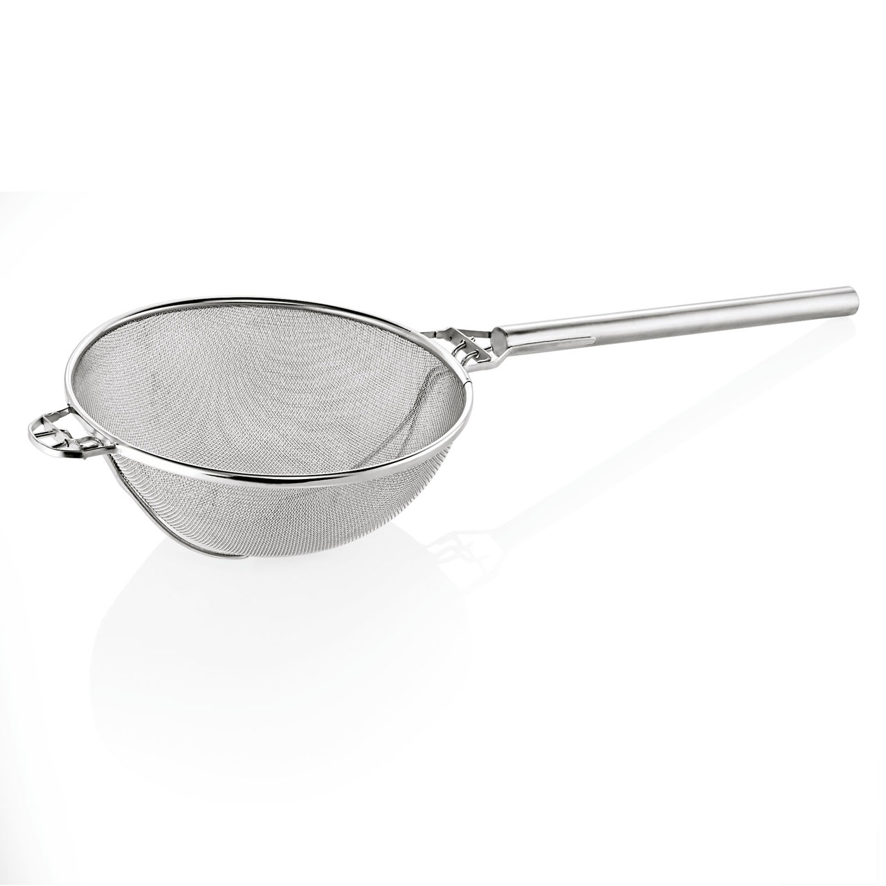 Profesionální kuchyňské síto s dutou rukojetí, průměr 30 cm, velikost oka 2 mm, chromniklová nerezová ocel. Vynikající volba pro moderní gastronomii i náročné domácí použití.