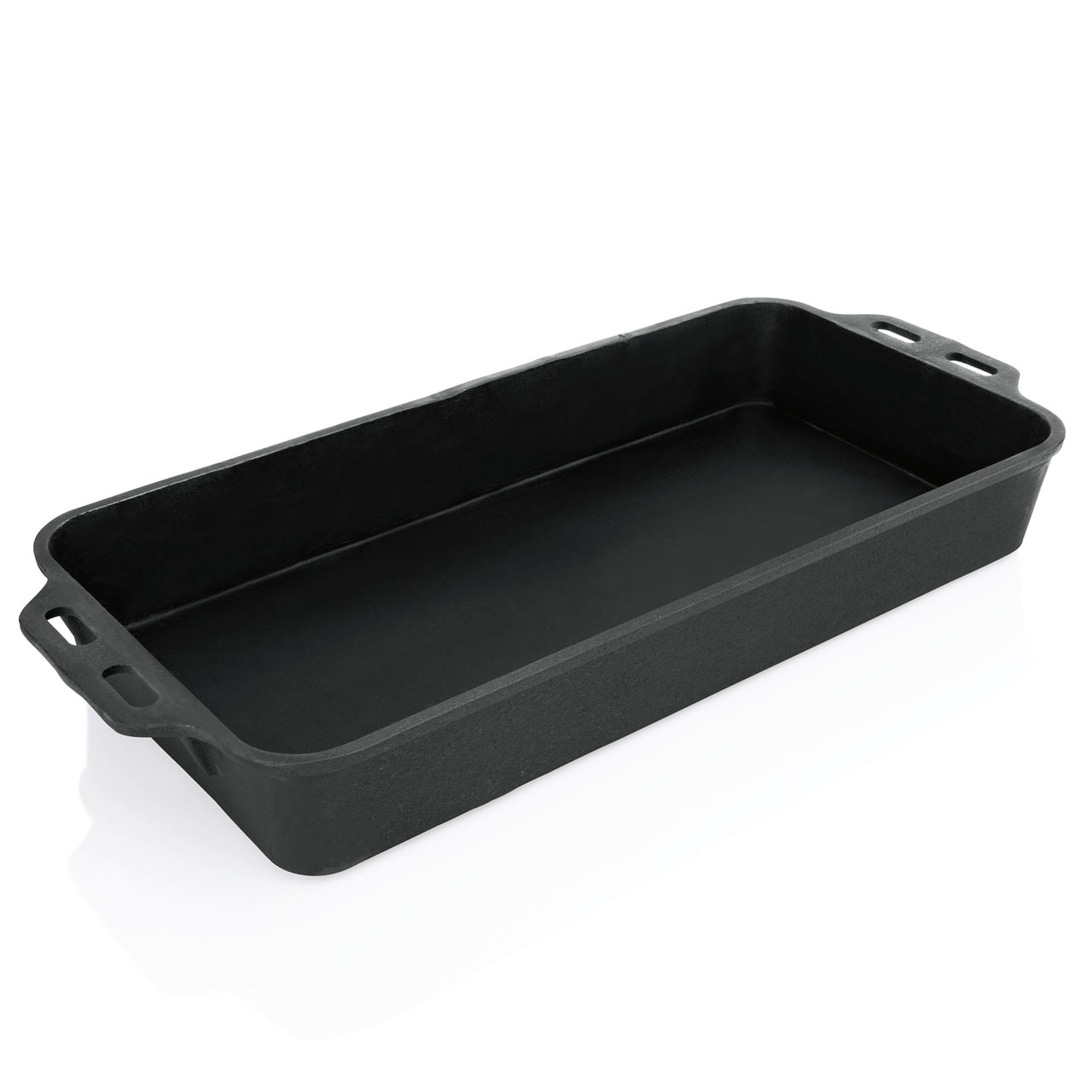 Litinový pekáč s integrovanými uchy – 71 x 34,5 x 9,5 cm. Velkokapacitní litinový pekáč s dvěma tvarovanými bočními uchy pro pohodlnou manipulaci. Díky rozměrům a robustní konstrukci je ideální pro přípravu většího množství pokrmů – pečeně, drůbeže i zeleninových směsí.