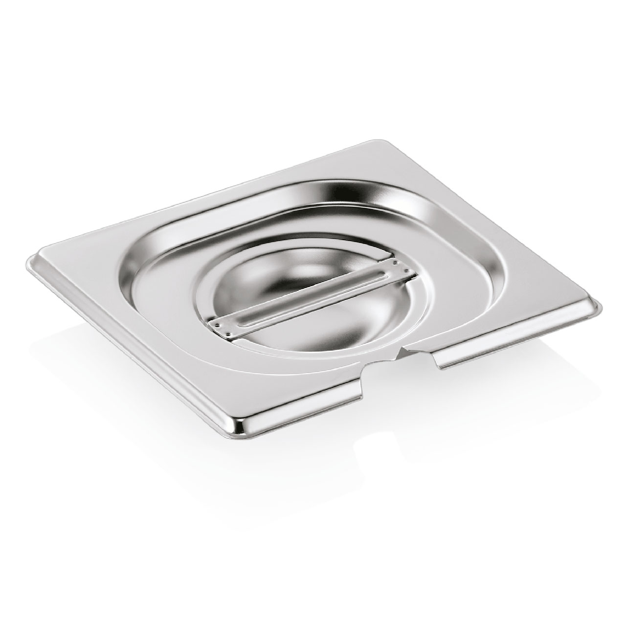 GN poklice GN CORE 1/6, s otvorem na naběračku a výřezy na ucha, chromniklová nerezová ocel. Ideální pro profesionální použití v gastronomii. Vysoce kvalitní materiál zajišťuje dlouhou životnost a spolehlivost.