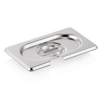 GN poklice GN CORE 1/9, s otvorem na naběračku a výřezy na ucha, chromniklová nerezová ocel. Ideální pro profesionální použití v gastronomii. Vysoce kvalitní materiál zajišťuje dlouhou životnost a spolehlivost.