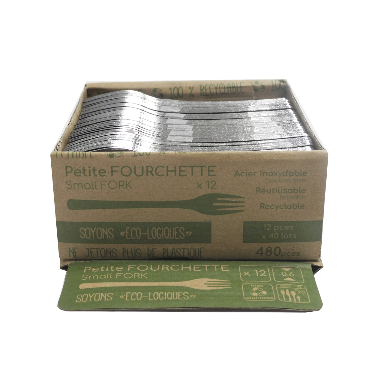 Mini vidlička z nerezové oceli o síle 0,6 mm Vhodná náhrada za plastové jednorázové příbory - plně rozložitelný materiál, díky možnosti umývat v myčce nádobí je možné použít i opakovaně Dodává se v balení po 12 ks.