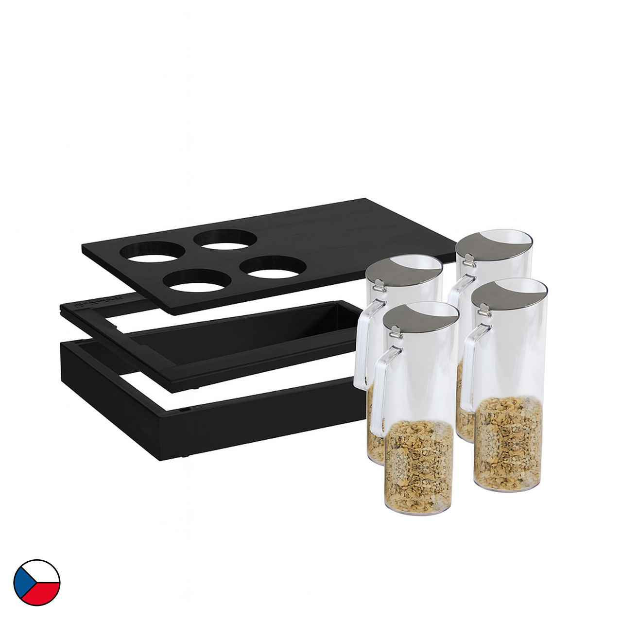 Neutrální modul s nástavcem se čtyřmi otvory pro karafy na cereálie je kompletní řešení pro snídaňový bufet. Tato sestava obsahuje 1 základní rám (58 x 40,5 x 6,5 cm), doplněný o horní dřevěný rám určený pro GN 1/1, ostatní příslušenství: horní nástavec se čtyřmi otvory, 4 x karafa polycarbonátová. Černý dřevěný dekor doladí každé prostředí, ať už jde o hotelovou snídaňovou zónu, firemní bufet nebo cateringové akce. Díky jednoduchému modulárnímu systému lze sestavu snadno přesouvat, kombinovat a přizpůsobovat konkrétním prostorům.