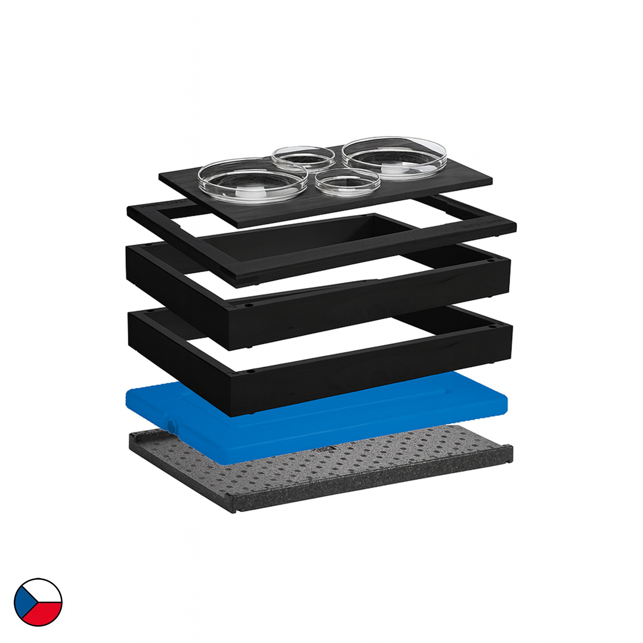 Chlazený modul se 4 miskami je kompletní řešení pro studený bufet. Tato sestava obsahuje 2 základní rámy (58 x 40,5 x 6,5 cm), doplněné o horní dřevěný rám určený pro GN 1/1, ostatní příslušenství: černá termoizolační podložka, chladicí vložka, dřevěný nástavec se 4 otvory pro misky, 2 x skleněná miska 12 cm, 2 x skleněná miska 20 cm. Černý dřevěný dekor doladí každé prostředí, ať už jde o hotelovou snídaňovou zónu, firemní bufet nebo cateringové akce. Díky jednoduchému modulárnímu systému lze sestavu snadno přesouvat, kombinovat a přizpůsobovat konkrétním prostorům.