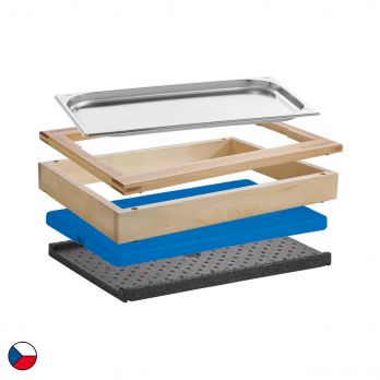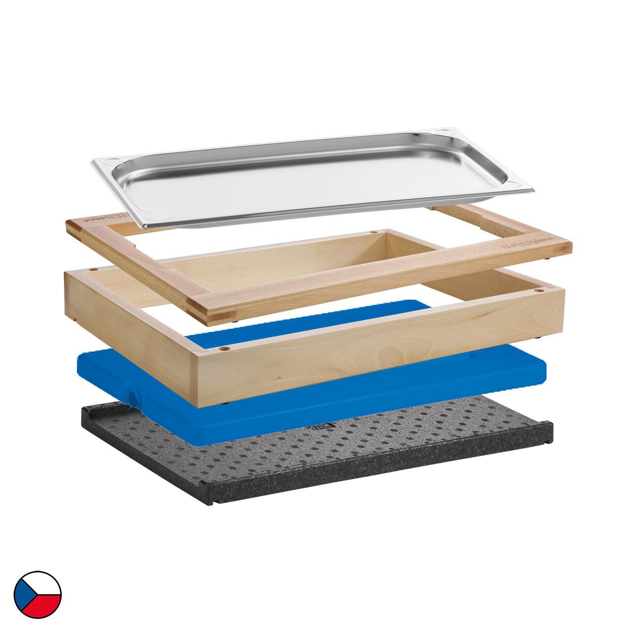 Chlazený modul je kompletní řešení pro studený bufet. Tato sestava obsahuje 1 základní rám (58 x 40,5 x 6,5 cm), doplněný o horní dřevěný rám určený pro GN 1/1, ostatní příslušenství: černá termoizolační podložka, chladicí vložka, nerezová gastronádoba GN 1/1-20 mm. Neutrální dřevěný dekor jemně doladí každé prostředí, ať už jde o hotelovou snídaňovou zónu, firemní bufet nebo cateringové akce. Díky jednoduchému modulárnímu systému lze sestavu snadno přesouvat, kombinovat a přizpůsobovat konkrétním prostorům.