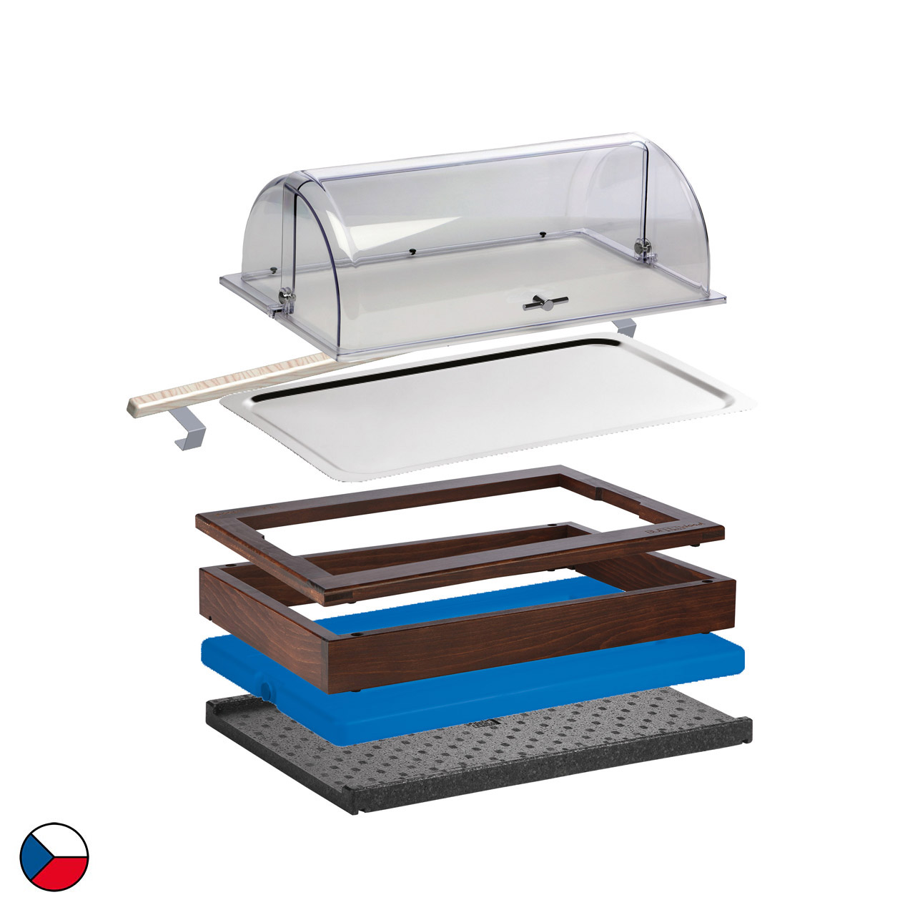 Chlazený modul v tmavém dekoru je kompletní řešení pro studený bufet. Tato sestava obsahuje 1 základní rám (58 x 40,5 x 6,5 cm), doplněný o horní dřevěný rám určený pro GN 1/1, ostatní příslušenství: černá termoizolační podložka, chladicí vložka, nerezová gastronádoba GN 1/1-20 mm, akrylový roll-top poklop, zajišťovací lišta. Dřevěný dekor v tmavém provedení jemně doladí každé prostředí, ať už jde o hotelovou snídaňovou zónu, firemní bufet nebo cateringové akce. Díky jednoduchému modulárnímu systému lze sestavu snadno přesouvat, kombinovat a přizpůsobovat konkrétním prostorům.