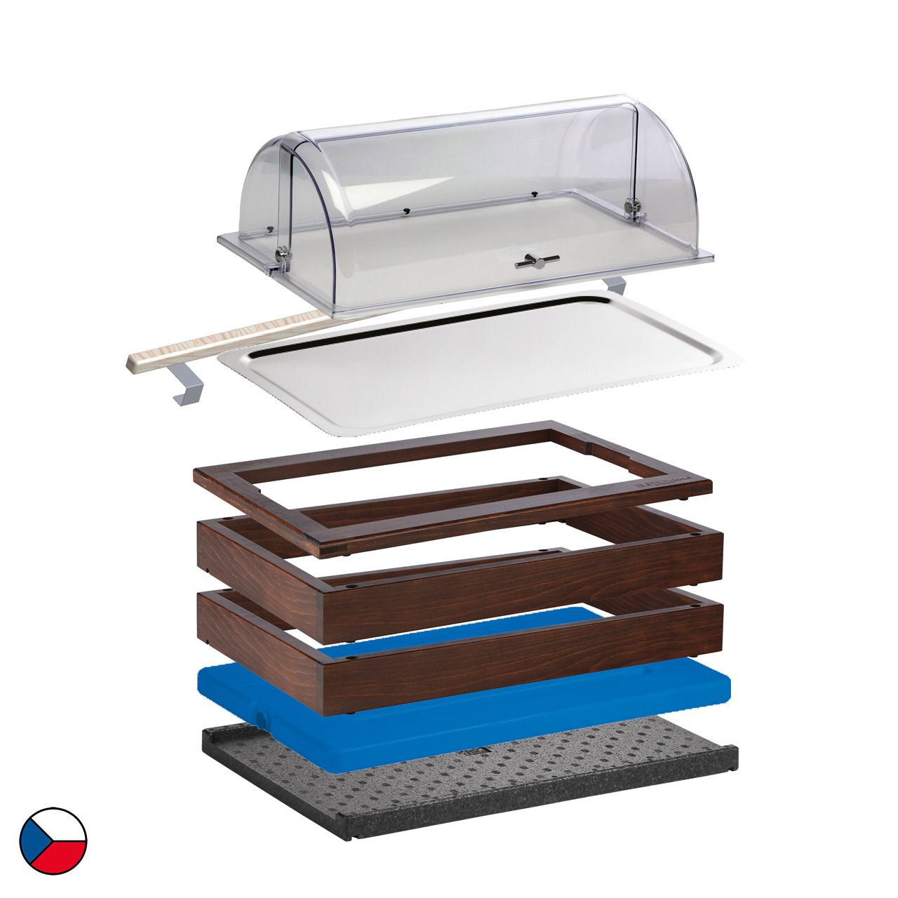 Chlazený modul v tmavém dekoru je kompletní řešení pro studený bufet. Tato sestava obsahuje 2 základní rámy (58 x 40,5 x 6,5 cm), doplněné o horní dřevěný rám určený pro GN 1/1, ostatní příslušenství: černá termoizolační podložka, chladicí vložka, nerezová gastronádoba GN 1/1-20 mm, akrylový roll-top poklop, zajišťovací lišta. Dřevěný dekor v tmavém provedení jemně doladí každé prostředí, ať už jde o hotelovou snídaňovou zónu, firemní bufet nebo cateringové akce. Díky jednoduchému modulárnímu systému lze sestavu snadno přesouvat, kombinovat a přizpůsobovat konkrétním prostorům.