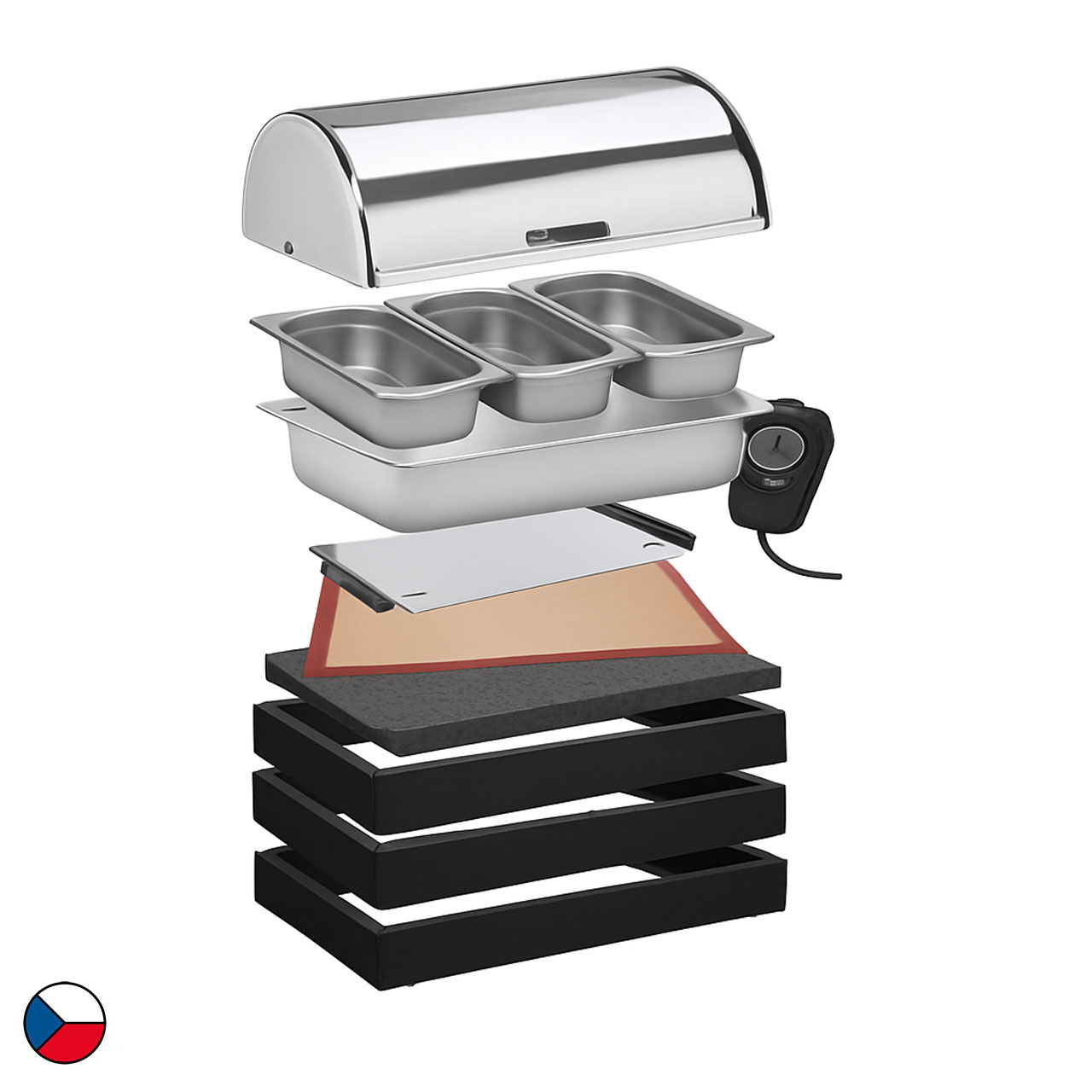 Vyhřívaný modul je kompletní řešení pro teplý bufet. Tato sestava obsahuje 3 základní rámy (58 x 40,5 x 6,5 cm), doplněné o horní dřevěný rám určený pro vodní lázeň, ostatní příslušenství: černá termoizolační podložka, silikonová vložka, elektrické topení 400 W, 3 x nerezová gastronádoba GN 1/3-65 mm, nerezový roll-top poklop. Elegantní černý dekor doladí každé prostředí, ať už jde o hotelovou snídaňovou zónu, firemní bufet nebo cateringové akce. Díky jednoduchému modulárnímu systému lze sestavu snadno přesouvat, kombinovat a přizpůsobovat konkrétním prostorům.