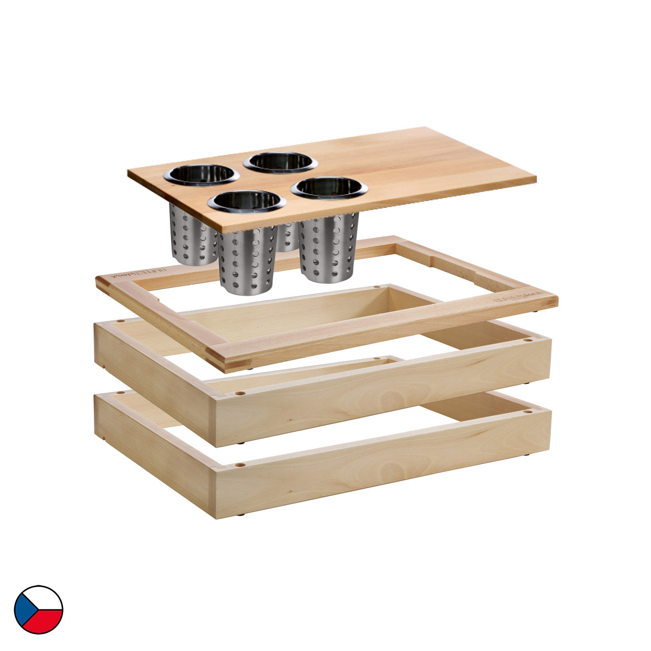 Neutrální modul s nástavcem se čtyřmi otvory na příborové košíky je kompletní řešení pro snídaňový bufet. Tato sestava obsahuje 2 základní rám (58 x 40,5 x 6,5 cm), doplněné o horní dřevěný rám určený pro GN 1/1, ostatní příslušenství: horní nástavec se čtyřmi otvory, 4 x nerezový příborový košík. Neutrální dřevěný dekor jemně doladí každé prostředí, ať už jde o hotelovou snídaňovou zónu, firemní bufet nebo cateringové akce. Díky jednoduchému modulárnímu systému lze sestavu snadno přesouvat, kombinovat a přizpůsobovat konkrétním prostorům.