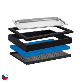 Chlazený modul je kompletní řešení pro studený bufet. Tato sestava obsahuje 1 základní rám (58 x 40,5 x 6,5 cm), doplněný o horní dřevěný rám určený pro GN 1/1, ostatní příslušenství: černá termoizolační podložka, chladicí vložka, nerezová gastronádoba GN 1/1-20 mm. Černý dřevěný dekor jemně doladí každé prostředí, ať už jde o hotelovou snídaňovou zónu, firemní bufet nebo cateringové akce. Díky jednoduchému modulárnímu systému lze sestavu snadno přesouvat, kombinovat a přizpůsobovat konkrétním prostorům.