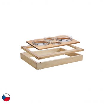 Neutrální modul s nástavcem pro 4 misky je kompletní řešení pro snídaňový bufet. Tato sestava obsahuje 1 základní rám (58 x 40,5 x 6,5 cm), doplněný o horní dřevěný rám určený pro GN 1/1, ostatní příslušenství: horní nástavec pro 4 misky, 2 x skleněná miska 12 cm, 2 x skleněná miska 20 cm. Neutrální dřevěný dekor jemně doladí každé prostředí, ať už jde o hotelovou snídaňovou zónu, firemní bufet nebo cateringové akce. Díky jednoduchému modulárnímu systému lze sestavu snadno přesouvat, kombinovat a přizpůsobovat konkrétním prostorům.