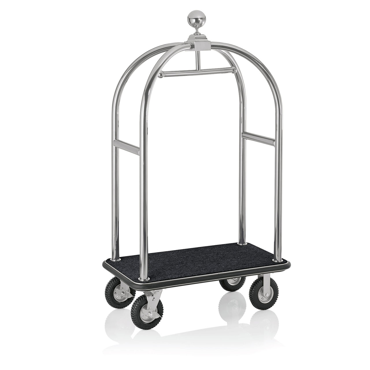 Transportní vozík na zavazadla, 112 x 60 x 190 cm, stříbrné provedení, kratáčovaná úprava, černá barva koberce, chromniklová nerezová ocel 18/8. Vhodné pro použití v hotelu.
