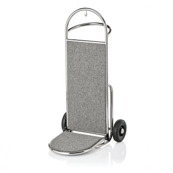 Transportní vozík na zavazadla SPRINT, 61 x 70 x 120 cm, stříbrné provedení, leštěný vzhled, šedá barva koberce, nerezová ocel. Vhodné pro použití v hotelu.