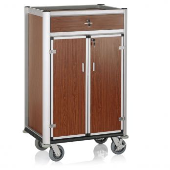 Servisní vozík na minibar, 85 x 60 x 135 cm, vzhled dřeva, s leklými hranami, hliník, MDF. Funkční a elegantní servisní vozík určený pro doplňování minibarů v hotelových pokojích. Kombinace kvalitních materiálů a moderního designu zajišťuje dlouhou životnost i reprezentativní vzhled při každodenním použití. Vhodné pro použití v hotelu.