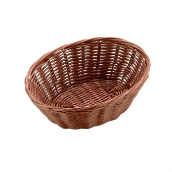 Lehký oválný košík z tmavého polypropylenového ratanu. Rozměr 18 x 13 x 6,5 cm. Vhodný pro pečivo, ovoce, příbory.