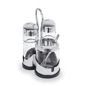 Menážka 3-dílná, Sůl a pepř, nádobka na omáčku, chromniklová nerezová ocel, nerez, umělá hmota, sklo. Ideální pro profesionální použití v gastronomii. Vysoce kvalitní materiál zajišťuje dlouhou životnost a spolehlivost.