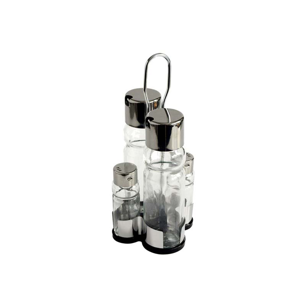Stolní dochucovací souprava pro sůl, pepř, olej a ocet. Kombinace nerez / sklo. Rozměr 11,5 x 10,5 cm, výška 22 cm.