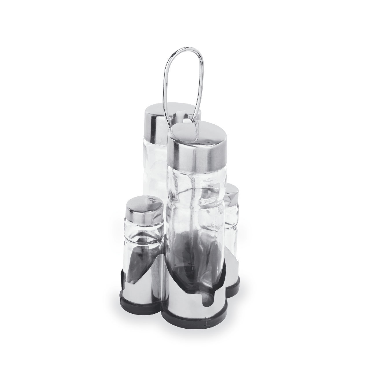 Menážka 4-dílná ocet a olej, Sůl a pepř, chromniklová nerezová ocel, nerez, umělá hmota, sklo. Ideální pro profesionální použití v gastronomii. Vysoce kvalitní materiál zajišťuje dlouhou životnost a spolehlivost.