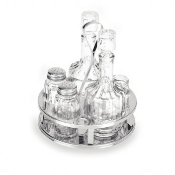 Menážka 5-ti dílná 1480, vinný ocet, solnička, pepřenka, nádobka na párátka, výška 17 cm, nerezová ocel, sklo. Vynikající volba pro moderní gastronomii i náročné domácí použití.