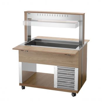 Bufetový chladicí vozík pro 3x GN 1/1-200 mm (530 x 325 mm) s hygienickou ochranou a LED osvětlením (lze spínat samostatně). 5x otočná kolečka, 2 z toho uzamykatelná. Dodává se smontovaný. Součástí 3 příčky: D 528, Š 30 mm. Materiál laminované dřevo, nerez, plast. Barva jilmu. Parametry: - 1 nerezová vana, výpustný kohout - pro 3x GN 1/1 (530x325 mm), max. do 200 mm (gastronádoby nejsou součástí dodávky) - teplotní rozsah 2 až 4 °C - sklápěcí police na tácy, rozměr: Š 1170 x H 250 mm - LED osvětlení, lze spínat samostatně - hygienická ochrana proti vnějším vlivům - kontrolka ZAP / VYP - spirálový propojovací kabel, délka 1,8 m - 5x otočná kolečka, 2 z toho uzamykatelná. Příkon: 0,34 kW / 230 V / 50 Hz Rozměr: Š 1170 x H 1245 x V 1510 mm Hmotnost: 137 kg