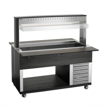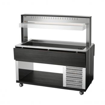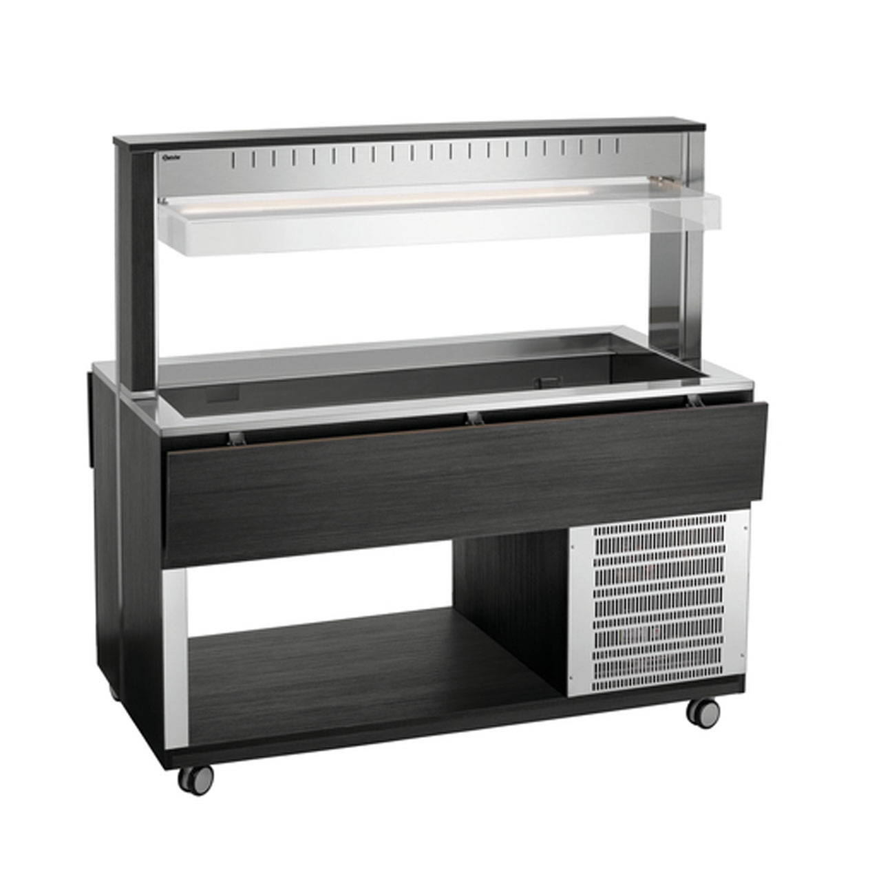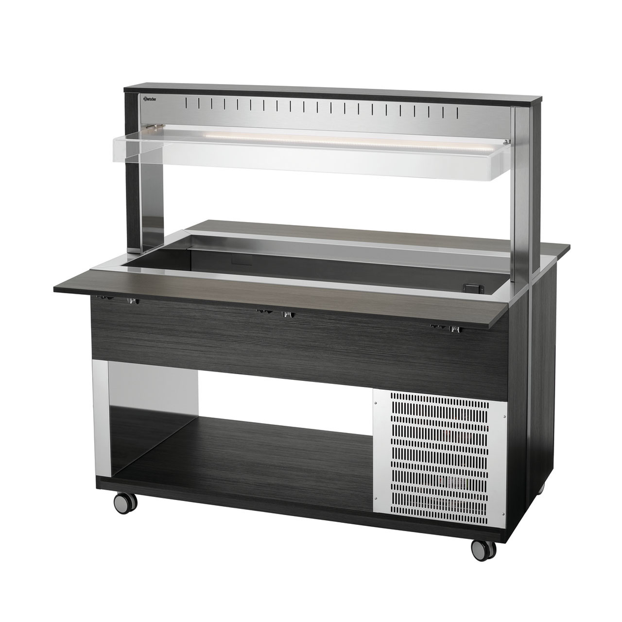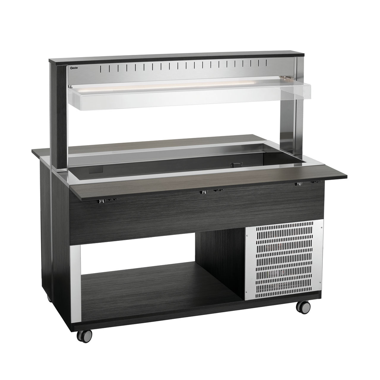 Bufetový chladicí vozík pro 4x GN 1/1-200 mm (530 x 325 mm) s hygienickou ochranou a LED osvětlením (lze spínat samostatně). 6x otočná kolečka, 2 z toho uzamykatelná. Dodává se smontovaný. Součástí 4 příčky: D 528, Š 30 mm. Materiál laminované dřevo, nerez, plast. Barva antracit. Parametry: - 1 nerezová vana, výpustný kohout - pro 4x GN 1/1 (530x325 mm), max. do 200 mm (gastronádoby nejsou součástí dodávky) - teplotní rozsah 2 až 4 °C - sklápěcí police na tácy, rozměr: Š 1495 x H 250 mm - LED osvětlení, lze spínat samostatně - hygienická ochrana proti vnějším vlivům - kontrolka ZAP / VYP - spirálový propojovací kabel, délka 1,8 m - 6x otočná kolečka, 2 z toho uzamykatelná. Příkon: 0,34 kW / 230 V / 50 Hz Rozměr: Š 1500 x H 1250 x V 1425 mm Hmotnost: 155,7 kg