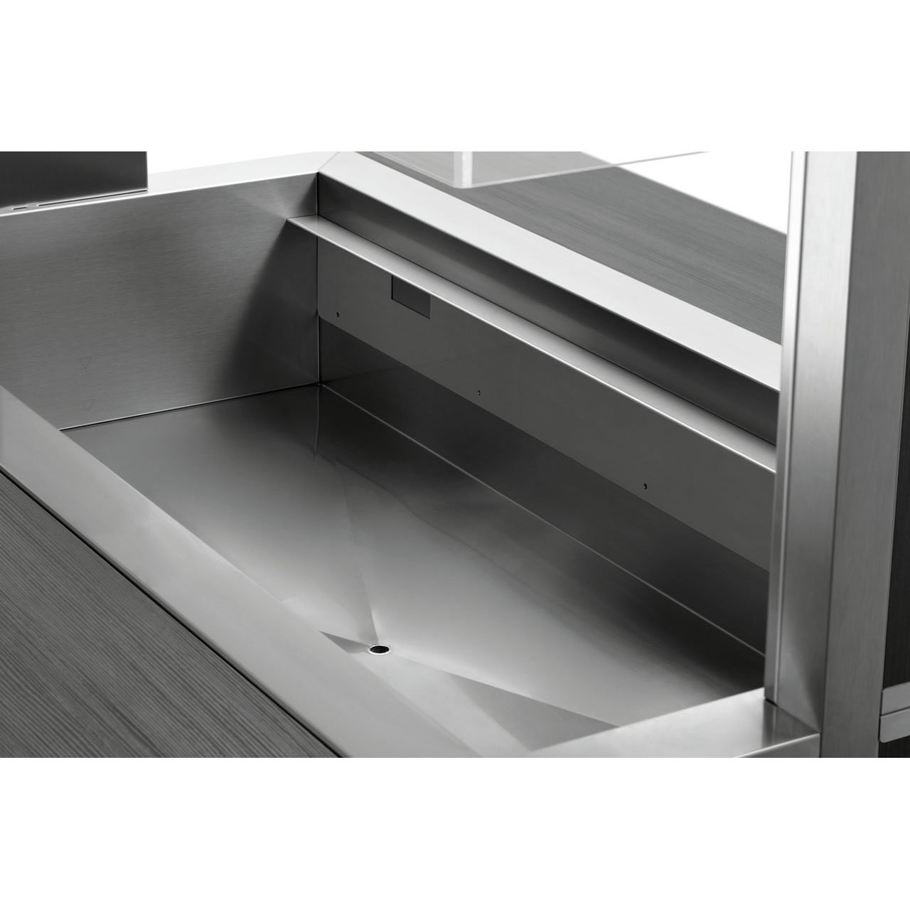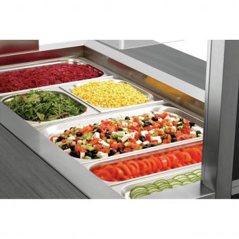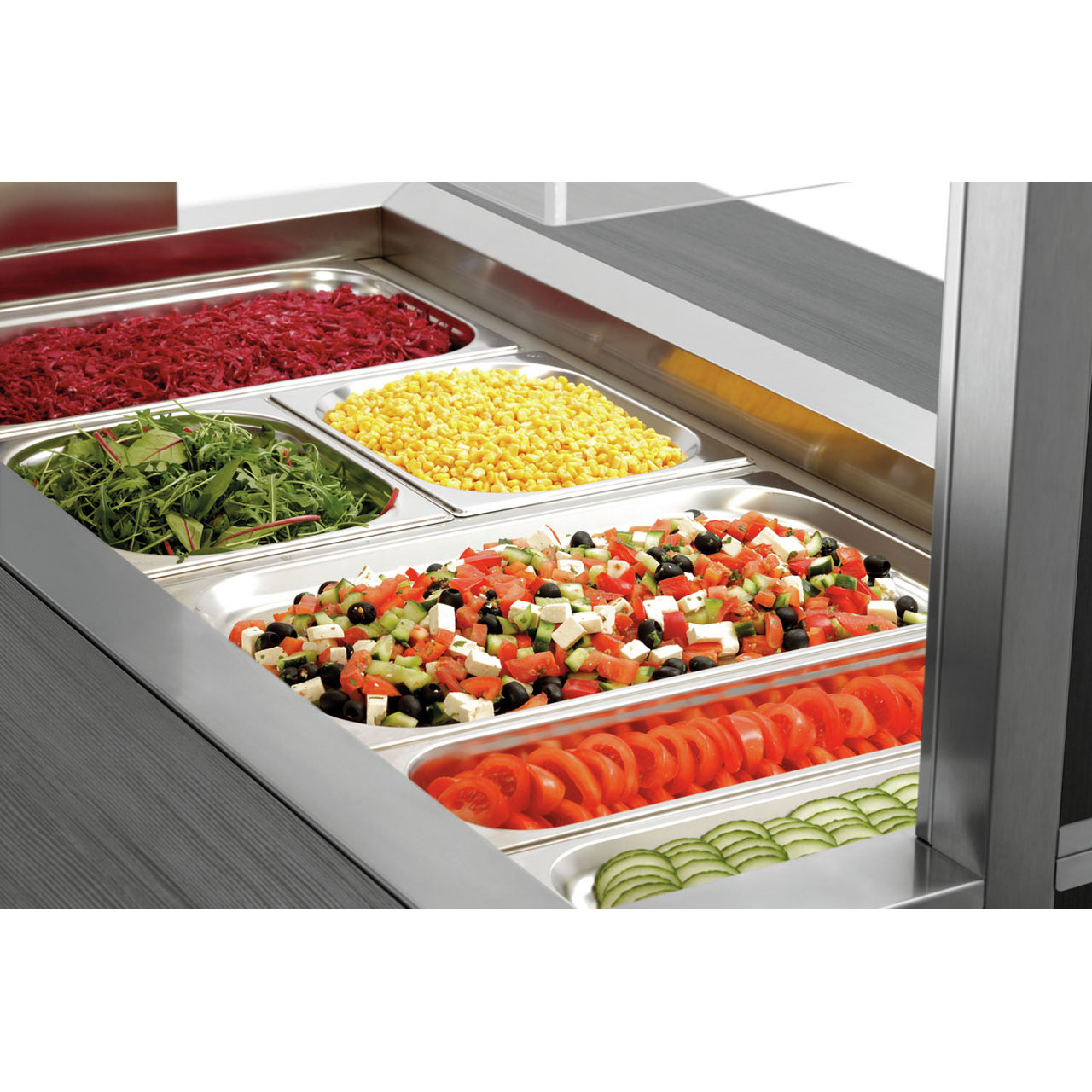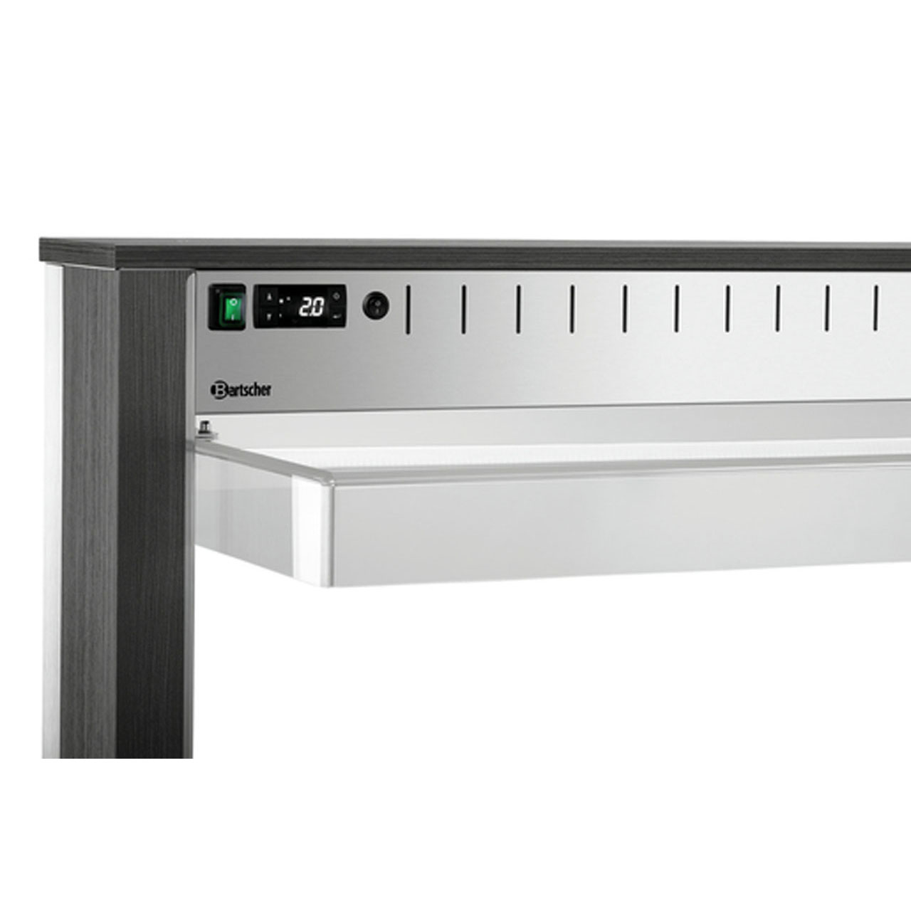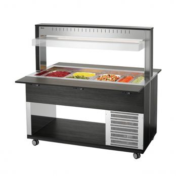 Bufetový chladicí vozík pro 4x GN 1/1-200 mm (530 x 325 mm) s hygienickou ochranou a LED osvětlením (lze spínat samostatně). 6x otočná kolečka, 2 z toho uzamykatelná. Dodává se smontovaný. Součástí 4 příčky: D 528, Š 30 mm. Materiál laminované dřevo, nerez, plast. Barva antracit. Parametry: - 1 nerezová vana, výpustný kohout - pro 4x GN 1/1 (530x325 mm), max. do 200 mm (gastronádoby nejsou součástí dodávky) - teplotní rozsah 2 až 4 °C - sklápěcí police na tácy, rozměr: Š 1495 x H 250 mm - LED osvětlení, lze spínat samostatně - hygienická ochrana proti vnějším vlivům - kontrolka ZAP / VYP - spirálový propojovací kabel, délka 1,8 m - 6x otočná kolečka, 2 z toho uzamykatelná. Příkon: 0,34 kW / 230 V / 50 Hz Rozměr: Š 1500 x H 1250 x V 1425 mm Hmotnost: 155,7 kg
