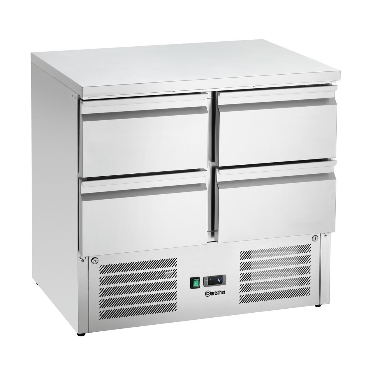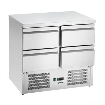 Chladicí stůl se 4 zásuvkami pro nádoby GN 1/1. Nerezový filtr vhodný do myčky a dobře přístupná technická jednotka. Dodáván smontovaný. Nelze použít pro zabudování. Gastronádoby nejsou součástí dodávky. Materiál nerezová ocel. 4 zásuvky, rozměr Š 304 x H 515 x V 140 mm, standardního formátu 1/1 GN teplotní rozmezí od 0 °C do 10 °C termostat, digitální regulace teploty, chlazení cirkulující vzduch, klimatická třída 4 chladivo R290 / 0,055 kg odpařování kondenzátu, digitální displej, elektronické ovládání, vypínač, kontrolka zapnutí/vypnutí Příkon: 0,204 kW / 230 V /50Hz. Rozměr: Š 903 x H 700 x V 880 mm. Hmotnost 82,0 kg.