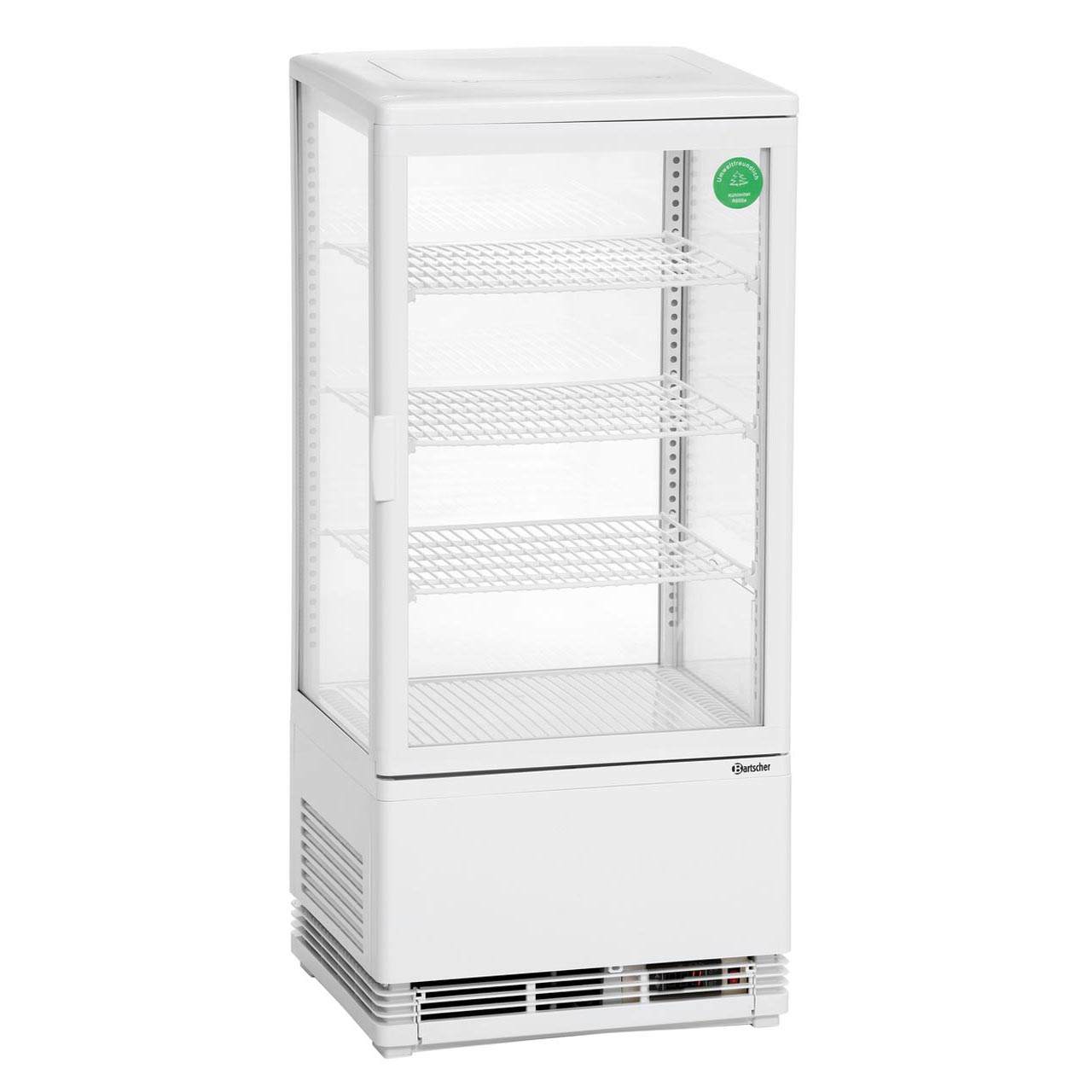 Chladící minivitrína s osvětlením. Chlazení oběhem vzduchu, automatické odmrazování. Příslušenství zahrnuje 3 výškově nastavitelné rošty, rozměr: 380 x 325 mm. - objem: 78 litrů - provozní teplota: od 2 do 6 °C (nastaveno od výrobce) - rozměr: Š 435 x H 385 X V 960 mm - příkon: 0,18 kW / 230 V - hmotnost: 33,2 kg