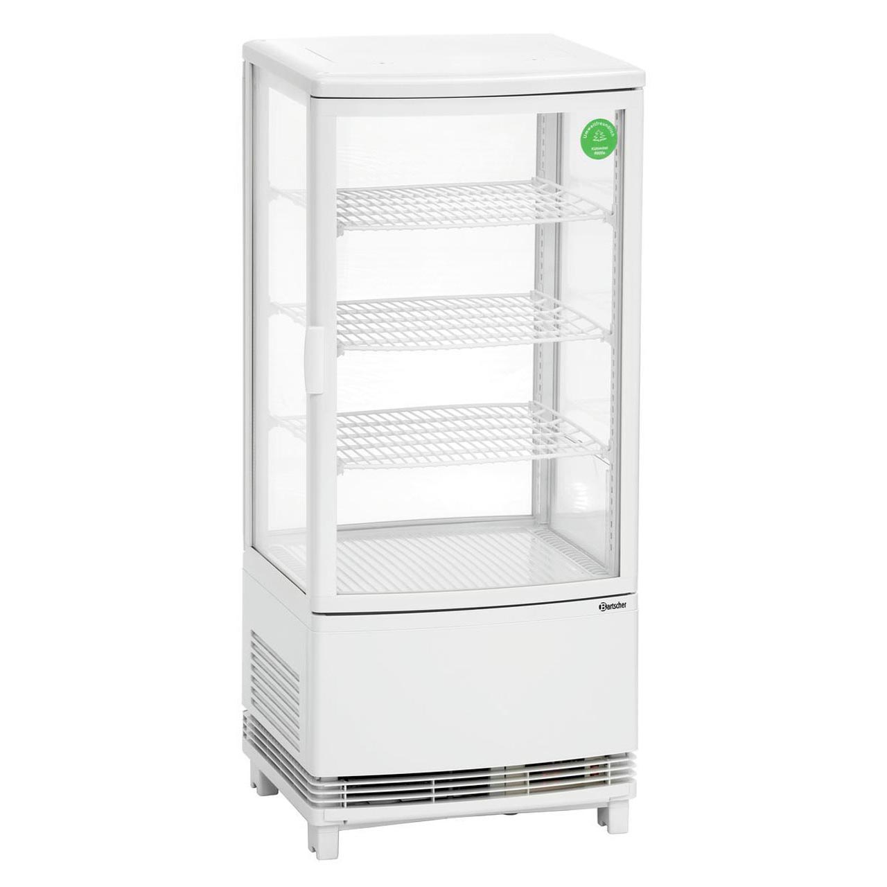 Chladící prosklená vitrína z odolného plastu s LED osvětlením, 2 klenuté dveře umožňují otvírání na přední a zadní straně, chlazení vzduchem. Barva: bílá. Automatické odmrazování. Objem: 86 litrů. Provozní teplota: od 2 do 6 °C(nastaveno od výrobce). Příkon: 0,18 kW/230 V. Rozměry: 425 (Š) x 435 (H) x 980 (V) mm. 3 výškově nastavitelné rošty. Hmotnost: 36,5 kg