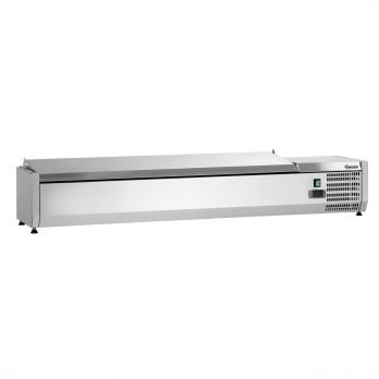 Chladicí vitrína pro 7 GN 1 hloubky max. 150 mm. Vitrína z chromniklové oceli, víko z ušlechtilé oceli. Gastronádoby nejsou součástí nabídky. Objednávejte samostatně. Provozní teplota: 0 až 10 °C, elektronické ovládání, automatické odtávání, statické chlazení, chladicí kapalina: R290, odpařování zkondenzované vody, digitální displej. Chladicí jednotka s chladicím žlabem. Příkon: 0,174 kW/230 V. Rozměr: Š 1500 x H 335 x V 290 mm. Hmotnost: 26 kg. Příslušenství zahrnuje: 4 příčky: délka 181 x šířka 25 mm 6 příček: délka 264 x šířka 25 mm