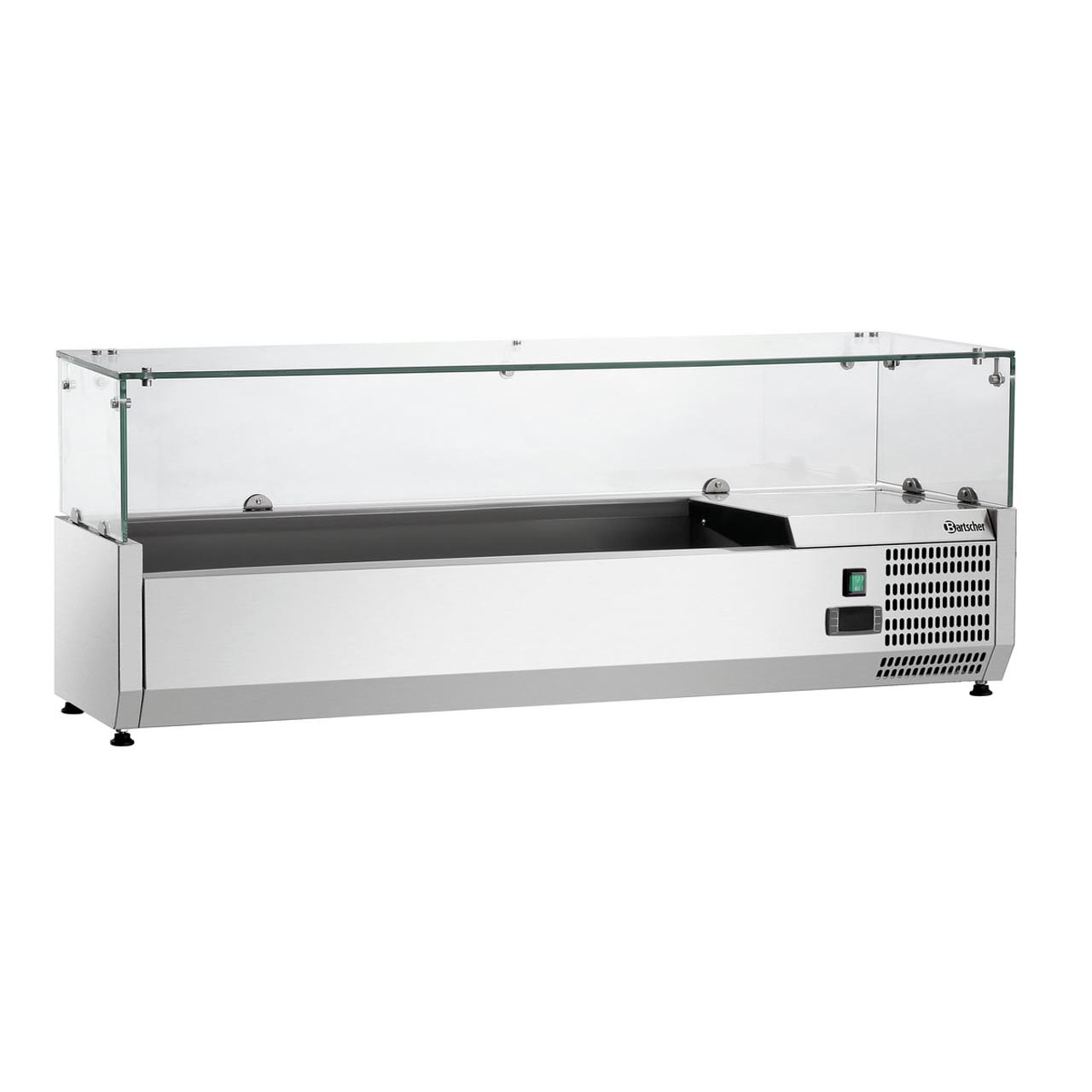 Chladicí nástavec z nerezové potravinářské oceli CNS se skleněným víkem pro 5 x 1/4 GN, o hloubce 150 mm. Elektronické ovládání, odpařování zkondenzované vody, automatické odtávání, digitální teploměr. Statické chlazení, chladivo R290. Provozní teplota: 0 °C až 10 °C. S uchycením na sklo. Chladicí jednotka s chladicím žlabem. Skleněný nástavec: Š 1190 x H 330 x V 195 mm, zadní strana otevřená, bezpečnostní sklo. Příkon: 0,166 kW/230 V. Rozměry: Š 1200 x H 335 x V 459 mm. Hmotnost: 36,5 kg. Příslušenství zahrnuje: 6 příček: 264 x 25 mm, 4 příčky: 181 x 25 mm. GN objednávejte samostatně.