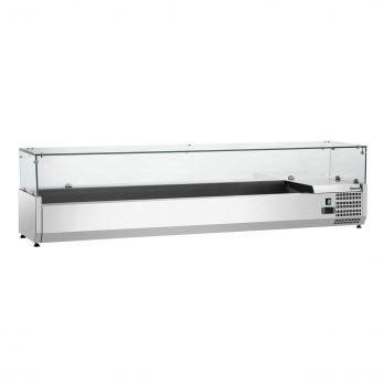Z nerezové potravinářské oceli CNS se skleněným nástavcem pro 8x1/3 GN, o hloubce 150 mm. Elektronické ovládání, odpařování zkondenzované vody, automatické odtávání, digitální teploměr. Statické chlazení, chladivo R290. Provozní teplota: 0 °C až 10 °C. Chladicí jednotka s chladicím žlabem. Provedení s uchycením na sklo. Skleněný nástavec: 1790 x 390 x 195 mm, bezpečnostní sklo. Příkon: 0,18 kW/230 V. Rozměry: Š 1800 x H 450 x V 430 mm. Hmotnost: 52kg. Příslušenství zahrnuje: 4 příčky: 181 x 25 mm, 8 příček: 326 x 25 mm. GN objednávejte samostatně.