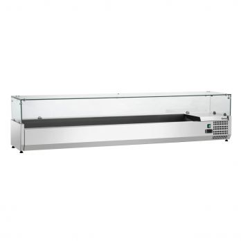 Z nerezové potravinářské oceli CNS se skleněným nástavcem pro 9x1/3 GN, o hloubce 150 mm. Elektronické ovládání, odpařování zkondenzované vody, automatické odtávání, digitální teploměr. Statické chlazení, chladivo R290. Provozní teplota: 0 °C až 10 °C. Chladicí jednotka s chladicím žlabem, provedení s upevněním na sklo. Skleněný nástavec: 1990 x 390 x 195 mm, bezpečnostní sklo. Příkon: 0,194 kW/230 V. Rozměry: Š 2100 x H 450 x V 430 mm. Hmotnost: 55,5 kg. Příslušenství zahrnuje: 1 příčku: 326 x 40 mm, 4 příčky: 181 x 25 mm, 9 příček: 326 x 25 mm. GN objednávejte samostatně.