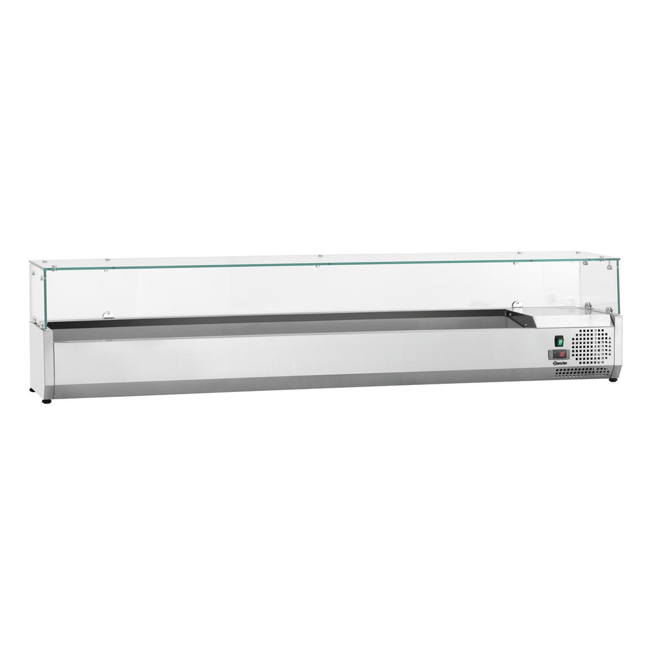 Chladicí vitrína se skleněným nástavcem s prostorem až pro 10 x 1/4 GN. Doplněk chladicího stolu na pizzu G-S7T2. Zkosené čelní sklo, bezpečnostní sklo, jednoduché zasklení. Rozměr skleněného nástavce: Š 1995 x H 330 x V 200 mm. Včetně 4 nožiček pro přišroubování, 10 příček: délka 270 mm, šířka 20 mm. Teplotní rozsah 2° do 8 °C. Elektronické ovládání, automatického odmrazování, kontrolka ZAP/VYP, digitální displej, ON/OFF. Digitální regulace teploty, klimatická třída 4, chlazení kompresorem, chladicí kapalina R290 / 0,045 kg. Dodáváno rozložená, jednoduchá montáž. Lze postavit i samostatně pomocí namontovaných nožiček. Kapacita GN 10 x 1/4 GN max. hloubky 150 mm. Gastronádoby nejsou součástí dodávky. Vlastnosti: chladicí agregát s chladicí vanou. Materiál nerezová ocel / sklo. Příkon: 0,13 kW / 230 V / 50 Hz Hmotnost 46,6 kg