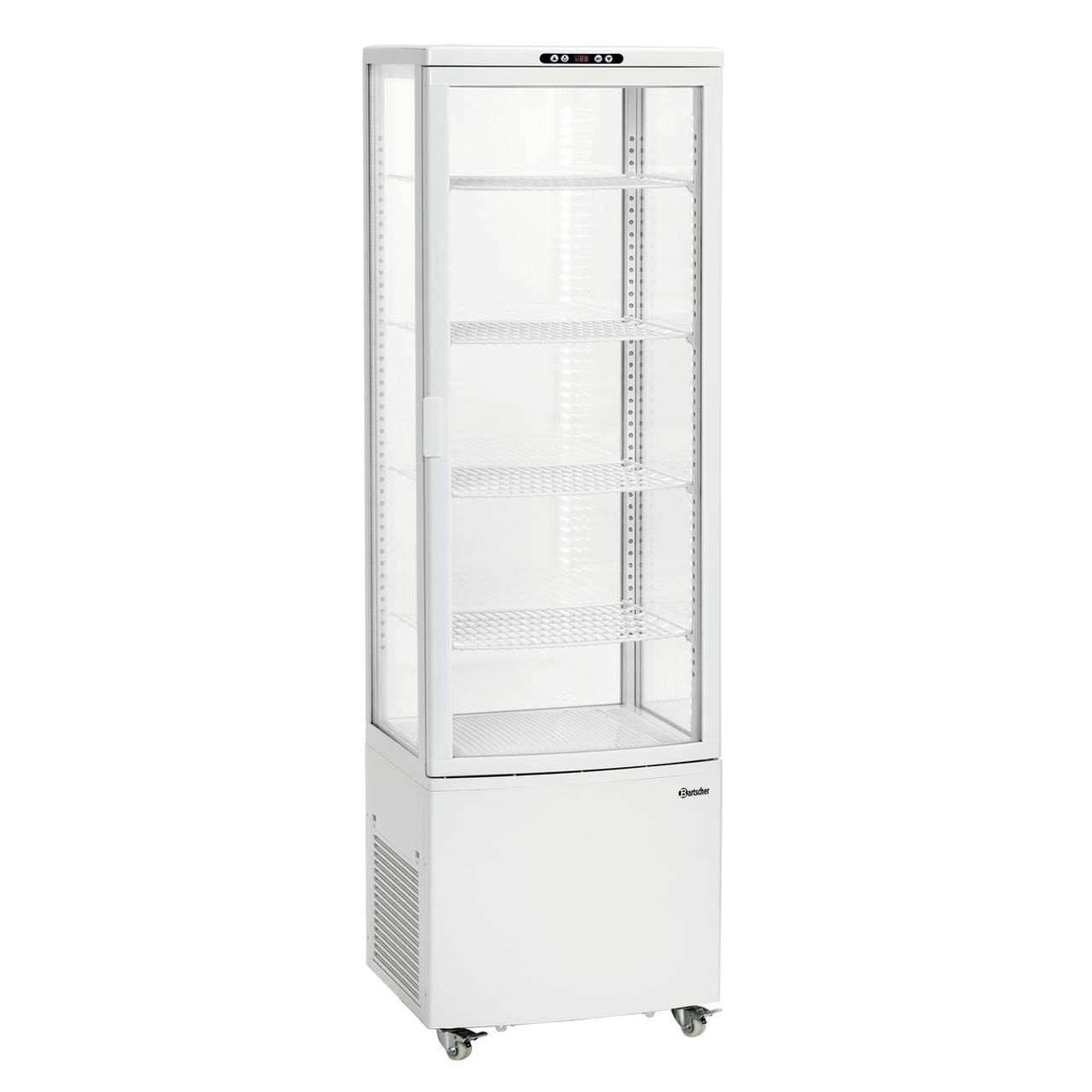 Prosklená vitrína bílé barvy, dvojité sklo, vnitřní osvětlení, LED osvětlen přední strany, chlazení vzduchem. Automatické odmrazování, odpařování. Objem: 235 litrů. Chladivo: R290, klimatická třída 4. Provozní teplota: 2 až 12 °C, digitální nastavení. Příkon: 0,38 kW/230 V. Rozměry: 525 (Š) x 455 (H) x 1703 (V) mm. 4 pojízdná kolečka, z toho 2 bržděná. 4 nastavitelné police (Š 452 x H 407 mm). Hmotnost: 80,2 kg. Plocha stání Š 515 x H 485 mm. Dveře sklo, pravé panty - neměnné. Materiál: odolný bílý plast a sklo.