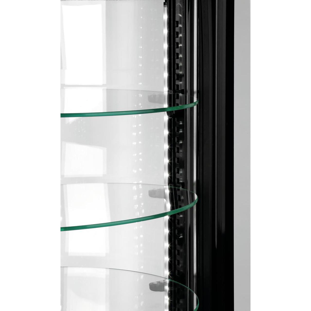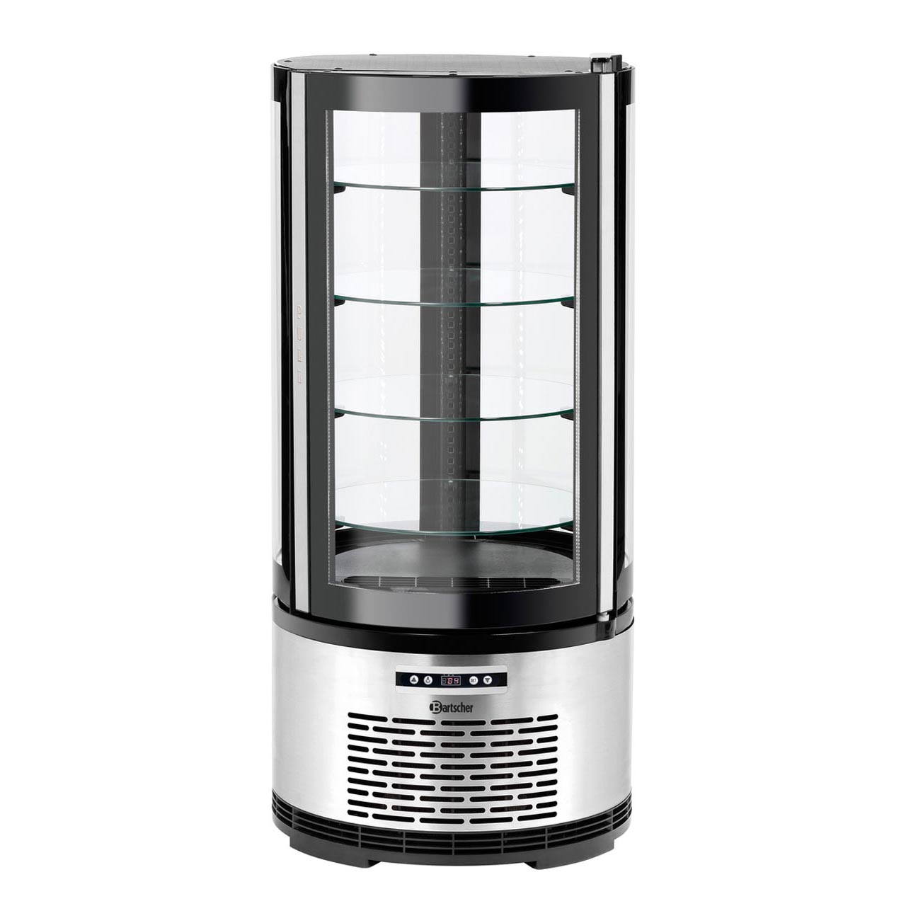 Prosklená kulatá chladící vitrína Bartscher má základnu z nerezové oceli. Plastové tělo se skleněnými dvojitými deskami - bezpečnostní sklo. Dveře s otevíráním doprava. LED osvětlení - individuálně přepínatelné. Chlazení s cirkulací vzduchu s jedním ventilátorem. Funkce automatického odmrazování s odpařováním vody. 4 výškově nastavitelné otočné police ze skla o průměru 390 mm. Teplotní rozsah: od 2 °C do 8 °C Kapacita: 100 l Výkon: 0,23 kW / 220-240 V Rozměry: pr. 495 mm x v. 1065 mm Hmotnost: 53 kg