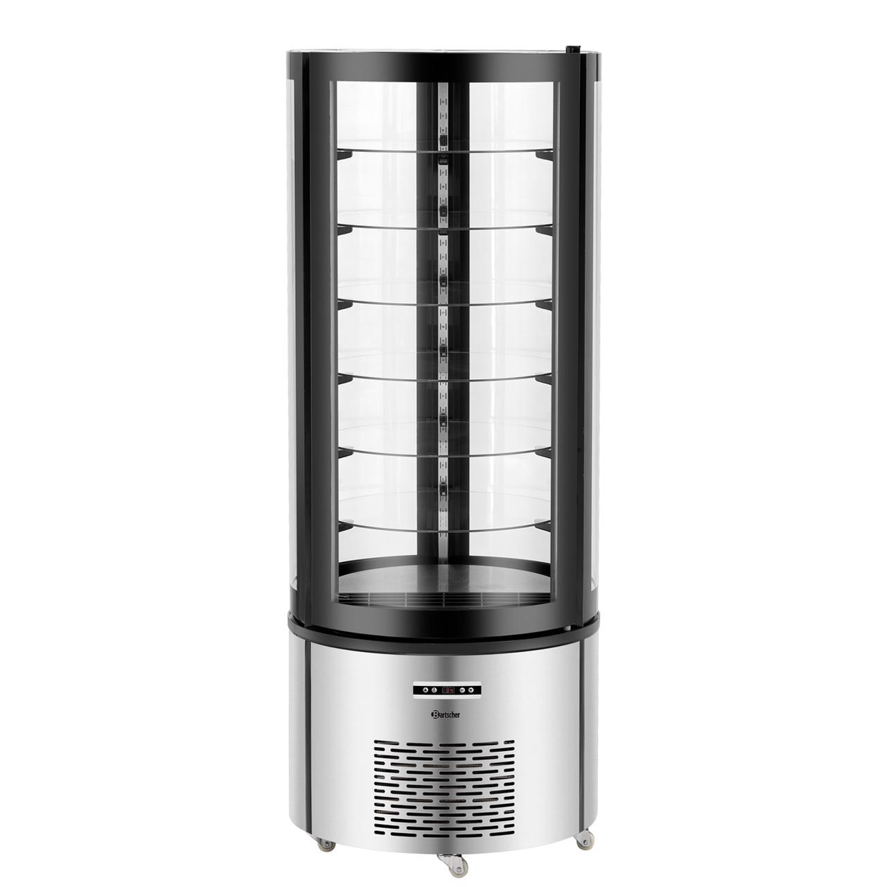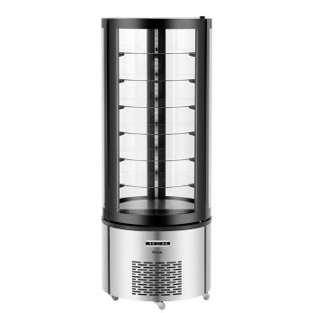 Cukrářská vitrína s otáčecími skleněnými policemi. Nerezové provedení s černým odolným plastem s celoplošným dvojitým zasklením. Jednodveřová. Nastavitelné, vyjímatelné, otočné police průměru 530 mm 6 kusů. Vlhkost max 75%, dvojité bezpečnostní sklo, teplota 2 až 10 °C, ventilovaný chladicí systém s automatickým odmrazováním. Chladící kapalina R290, LED osvětlení, digitální regulátor teploty. Posuvné dveře, 5 pojezdových koleček, z toho 2 brzděná.