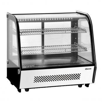Obslužná chlazená vitrína. Konstrukce z odolného plastu, LED osvětlení, prosklení z dvojitého bezpečnostního skla, přední sklo oblé, automatické odtávání, cirkulační chlazení se dvěma ventilátory, 2 výškově nastavitelné police, posuvné zadní dveře. Ideální nastavení teploty bylo naprogramováno ve výrobě a pohybuje se mezi 2 ° C (spodní teplotní limit) a 6 ° C (horní teplotní limit). Tato nastavení umožňují, aby chladicí vitrína fungovala v teplotním rozsahu cca. 2 ° - 12 ° C. Uživatel toto nastavení již nemůže změnit. - příkon: 0,16 kW /230 V - posuvné zadní dveře - objem 120 l - chlazení: R600a - rozměr: Š 710 x H 575 x V 685 mm - hmotnost: 57 kg Včetně 2 výškově nastavitelných roštů rozměrů: Horní: Š 630 x H 340 mm Spodní: Š 630 x H 370 mm