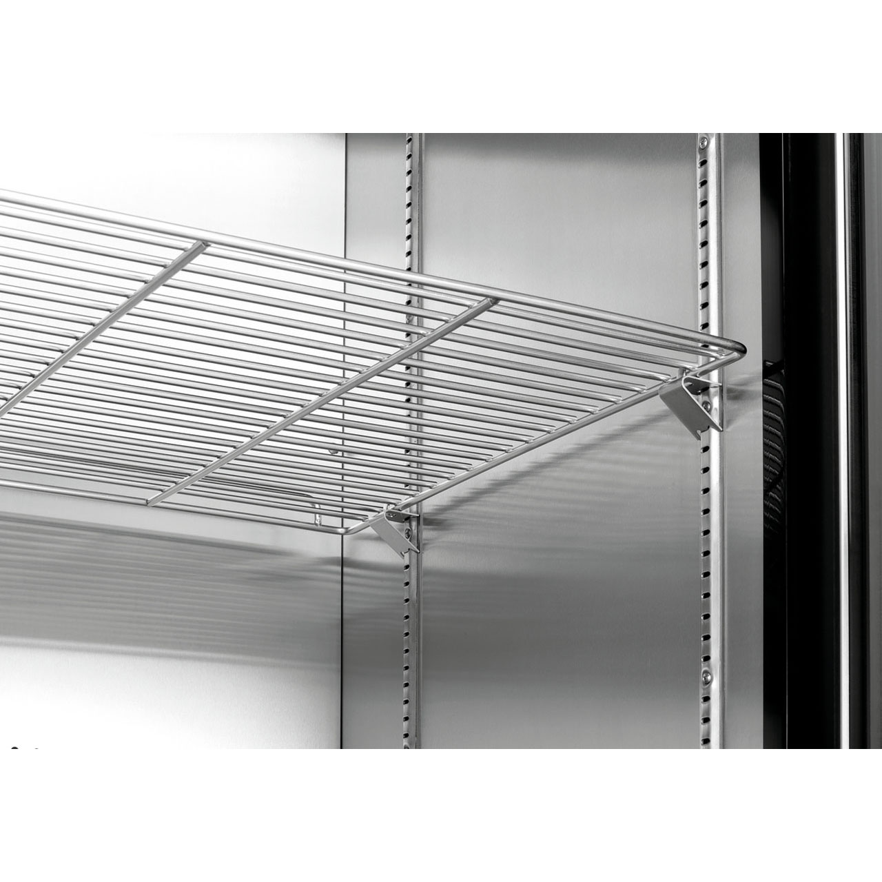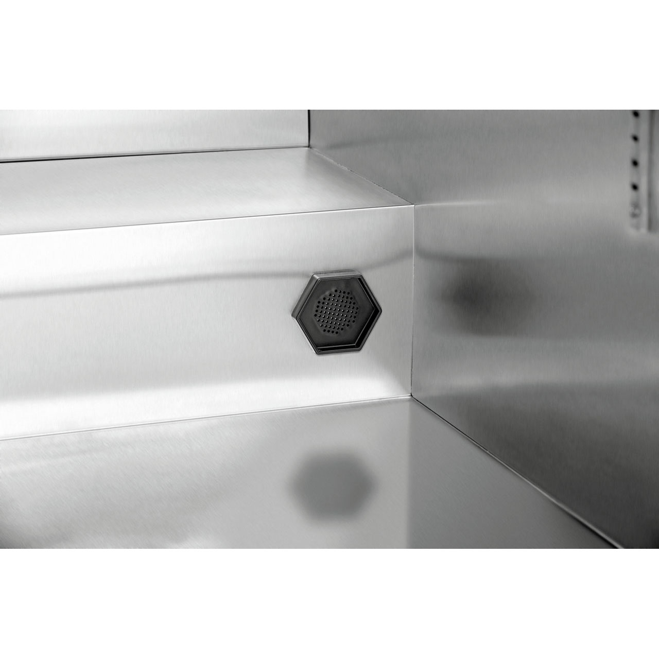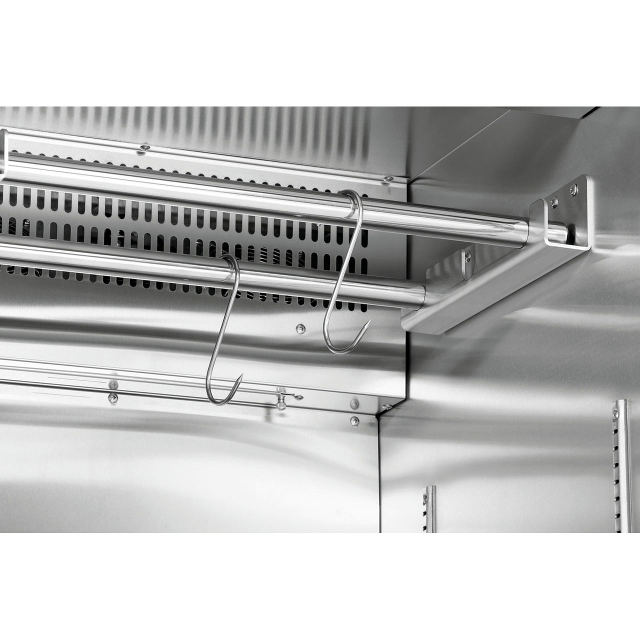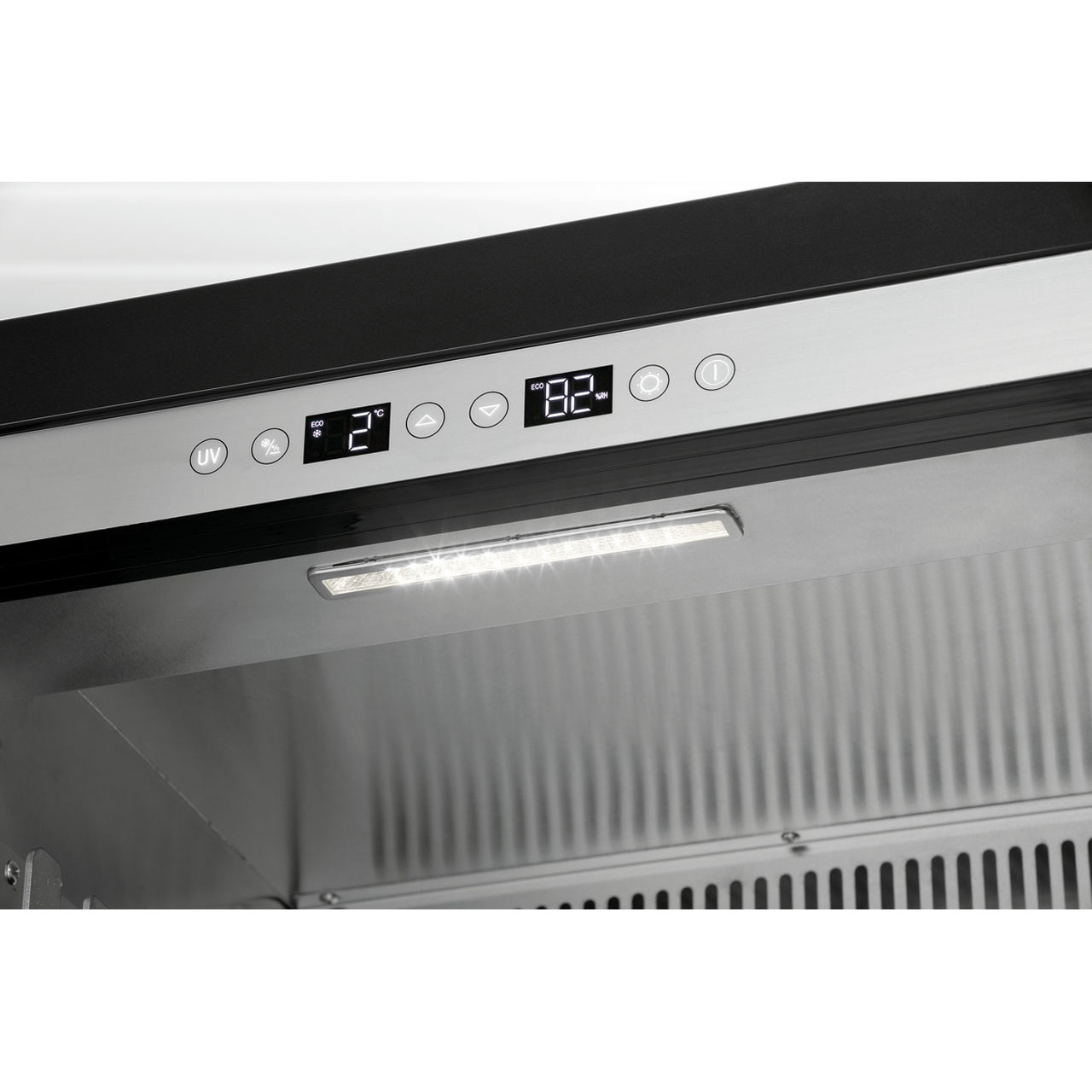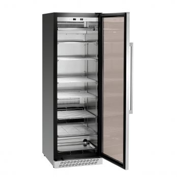 Lednice na zrání masa. Obsah 380 litrů.Teplotní rozhraní od 2 do 14 °C, elektronická regulace teploty po 1 °C. Vlhkost vzduchu 50 - 85 % regulovatelná po 1 %. Okolní teplota 18°C až 38°C. Dva filtry s aktivním uhlím. Termostat, izolace cyklopentan, UV lampa. Chlazení cirkulující vzduch, chladivo R600a / 0,055 kg. Odpařování kondenzátu. Automatické odtávání. Skříň je uzamykatelná, LED osvětlení. 1 skleněné křídlové dveře (trojité zasklení), pant dveří vpravo (nelze změnit), tónované sklo s UV filtrem, bezpečnostní. Nohy nejsou nastavitelné, ON/OFF, antibakteriální UV světlo, digitální ukazatel, dotykové ovládání, neutralizace zápachu díky filtru s aktivním uhlím. Manuální ovládání. Barva černá. Materiál ocelový plech, sklo, uvnitř ušlechtilá ocel. Včetně 2x aktivní uhlíkový filtr, 1 odkapávací miska, 1 rukojeť s montážním materiálem, 2 závěsné tyče + 6 řeznických háků, 2 nádrže na vodu + 2x náhradní nádrž + držák + odkapávací miska, 2 klíče, 7 nerezových roštů. Obsah: 380 litrů. Záso