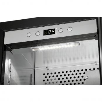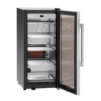 Lednice na zrání masa. Obsah 63 litrů. Teplotní rozhraní od 2 do 14 °C, elektronická regulace teploty po 1 °C. Vlhkost vzduchu 50 - 85 % regulovatelná po 1 %. Okolní teplota 18°C až 38°C. Jeden filtr s aktivním uhlím. Termostat, izolace cyklopentan, UV lampa. Chlazení cirkulující vzduch, chladivo R600a / 0,023 kg. Odpařování kondenzátu. Skříň je uzamykatelná, LED osvětlení. 1 skleněné křídlové dveře (trojité zasklení), pant dveří vpravo (nelze změnit), tónované sklo s UV filtrem, bezpečnostní. Výškově nastavitelné nohy, ON/OFF, antibakteriální UV světlo, digitální ukazatel, dotykové ovládání, neutralizace zápachu díky filtru s aktivním uhlím. Manuální ovládání. Barva černá. Materiál ocelový plech, sklo, uvnitř ušlechtilá ocel. Včetně 1 aktivního uhlíkového filtru, 1 odkapávací miska, 1 rukojeť s montážním materiálem, 1 závěsný stojan + 3 řeznické háky, 1 nádrž na vodu + 1 náhradní nádrž + držák + odkapávací miska, 2 klíče, 4 nerezové mřížky. Obsah: 63 litrů. Zásobník vody 300 ml. 4 r