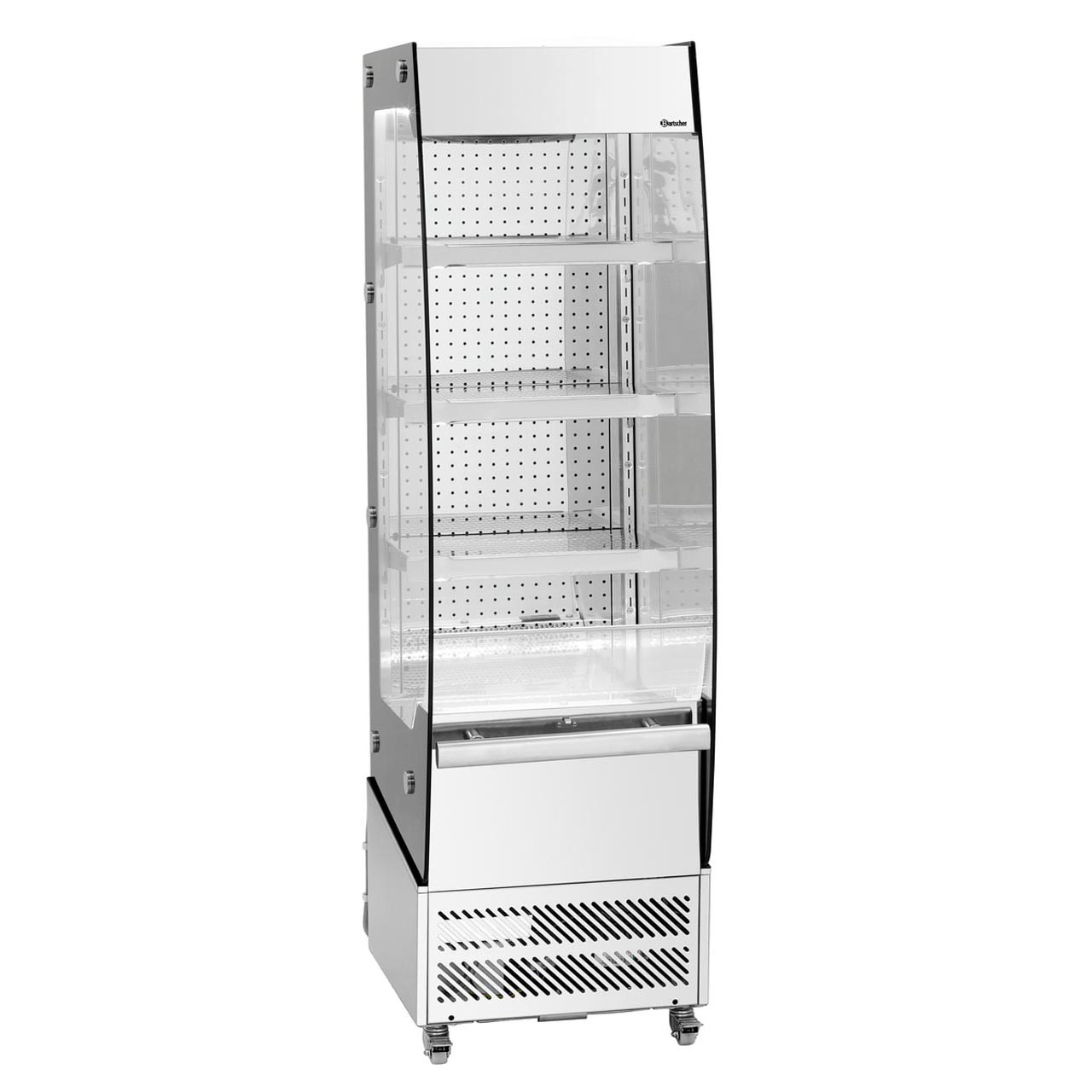 Objem 220 litrů. Digitální regulace teploty, digitální ukazatel, vnitřní osvětlení, LED, klimatická třída 6. Chlazení vzduchem. Chladivo R290 / 0,143 kg. Funkce automatického odmrazování a odtávání. Provedení z nerezové oceli a bezpečnostního skla. Noční roleta. 4 kolečka, z toho 2 bržděná. Barva stříbrná, černá. 3 regálové police, výškově nastavitelné s lištou pro ceny, rozměr spodní části Š 460 x H 285 x V 42 mm. Zastavěná plocha: 0,52 m2. Spodní část z ušlechtilé oceli, rozměr Š 442 x H 310 mm. Provozní teplota: od +2 °C do +10 °C. Příkon: 1,3 kW/ 230 V / 50 Hz. Rozměry: Š 490 x H 675 x V 1742 mm. Hmotnost: 94,6 kg.