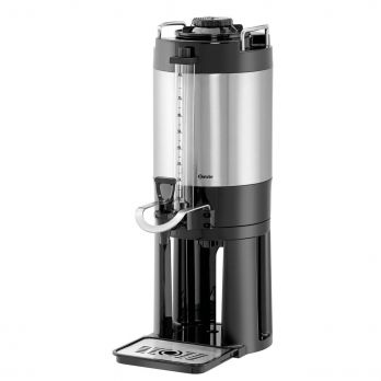 Nerezový zásobník na studené a teplé nápoje s dvojitou izolovanou stěnou. Nízké tepelné ztráty. Vodoznak, odnímatelná odkapávací miska, odnímatelný odkapávací zásobník a výpustný kohout, nerezová madla. Teplotní ztráta/hod. cca 1 °C. Objem 8 litrů. Pro hrnky do výšky cca 205 mm. Jednoduché plnění děleným víkem.