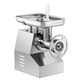 Extra velký podávací žlab, zpracování až 500 kg/hod. Vyjímatelná skartovací jednotka umožňuje dočasné skladování v lednici podle HACCP. Nástavce z nerezové oceli, vhodné pro mytí v myčce. Plášť a mlecí zařízení z nerezové oceli, násypka hliníková. Velký podávací skluz. Vyjímatelný mlýnek. Zpětný chod, ventilovaný motor, ochrana proti přetížení, vyjímatelná násypka průměr 76 mm , kontrolka: chod vpřed, chod vzad; zapnuto/vypnuto. Včetně: 1 děrovaný kotouč 6 mm, 1 nůž z nerezové oceli, 4 čepele, 1 pěchovač. Průměr kotoučů 100 mm. Vypínač. Připojení zařízení: 3 NAC, připraveno k zapojení. Příkon: 2,2 kW / 400 V / 50 Hz. Rozměr Š 320 x H 520 x V 550 mm. Hmotnost 43,0 kg.