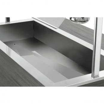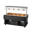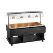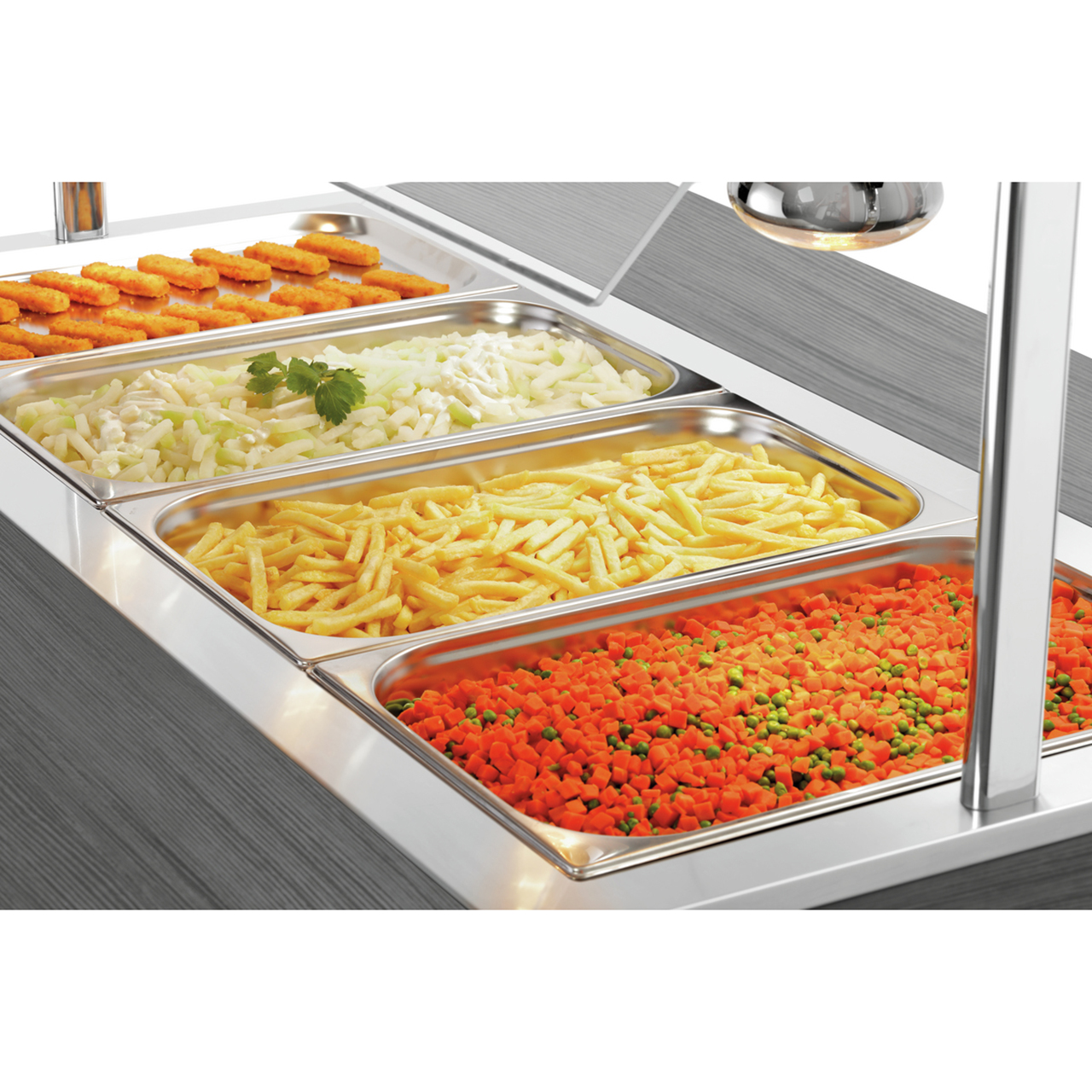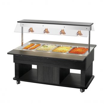 Bufetový vyhřívaný vozík pro 4x GN 1/1-150 mm (530 x 325 mm). Hygienická ochrana, osvětlení infračervené lampy (lze spínat samostatně). Provozní výšky 700 mm. Dodává se smontovaný. Součástí 4 příčky: D 528 x Š 30 mm. Materiál laminované dřevo, nerez, plast. Barva antracit. Provozní výška 700 mm. Parametry: - 1 vodní lázeň z nerezové oceli - výpustný kohout - pro 4x GN 1/1 (530x325 mm), max. do 150 mm (gastronádoby nejsou součástí dodávky) - teplotní rozsah 30 - 90 °C - sklápěcí police na tácy, rozměr: Š 1460 x H 250 mm - osvětlení 4x infračervené tepelné lampy, lze spínat samostatně - hygienická ochrana proti vnějším vlivům, zaoblené rohy - kontrolka ZAP / VYP - spirálový propojovací kabel, délka 1,0 m - 5x otočná kolečka, 2 z toho uzamykatelná. - 4 příčky: D 528 x Š 30 mm Příkon: 2262 kW / 230 V / 50 Hz Rozměr: Š 1425 x H 1160 x V 1200 mm Hmotnost: 96 kg
