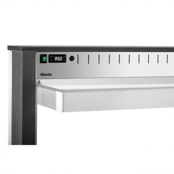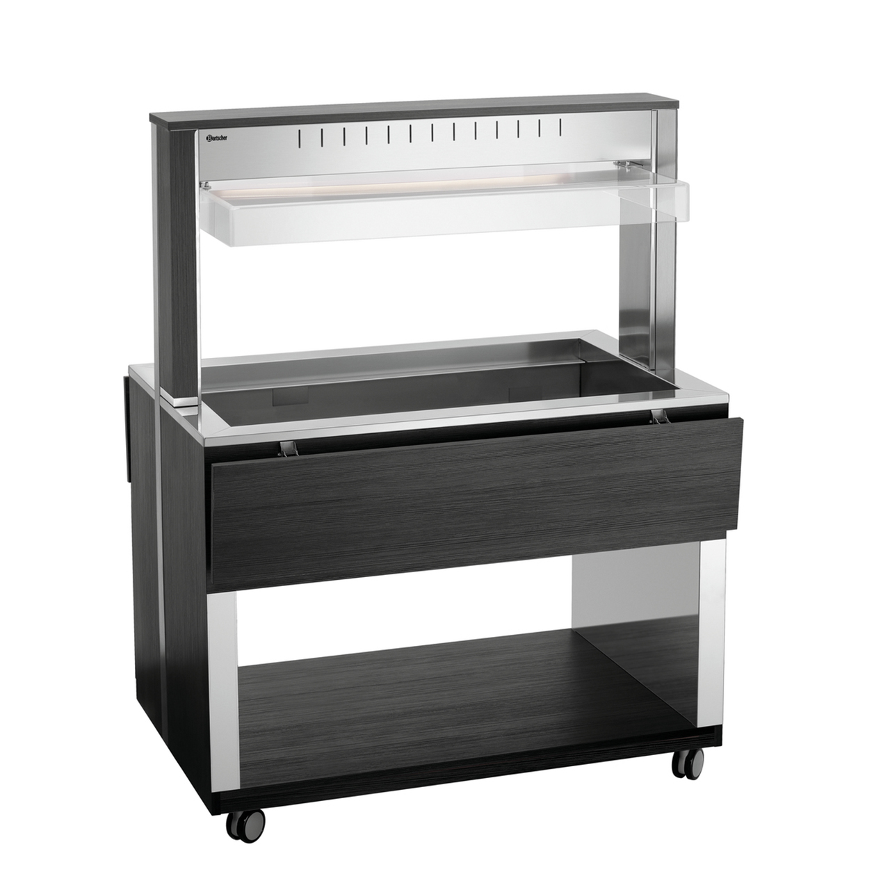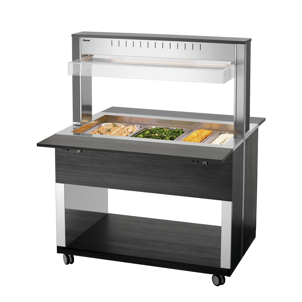 Bufetový vyhřívaný vozík pro 3x GN 1/1-200 mm (530 x 325 mm) s hygienickou ochranou a LED osvětlením (lze spínat samostatně). 4 otočná kolečka, 2 z toho uzamykatelná. Dodává se smontovaný. Součástí 3 příčky: D 528, Š 30 mm. Materiál laminované dřevo, nerez, plast. Barva anracit. Parametry: - 1 vodní lázeň z nerezové oceli - výpustný kohout - pro 3x GN 1/1 (530x325 mm), max. do 200 mm (gastronádoby nejsou součástí dodávky) - teplotní rozsah 30 - 90 °C - sklápěcí police na tácy, rozměr: Š 1170 x H 250 mm - LED osvětlení, lze spínat samostatně - hygienická ochrana proti vnějším vlivům - kontrolka ZAP / VYP - spirálový propojovací kabel, délka 1,6 m - 4 otočná kolečka, 2 z toho uzamykatelná. Příkon: 2262 kW / 230 V / 50 Hz Rozměr: Š 1170 x H 1250 x V 1510 mm Hmotnost: 110,6 kg