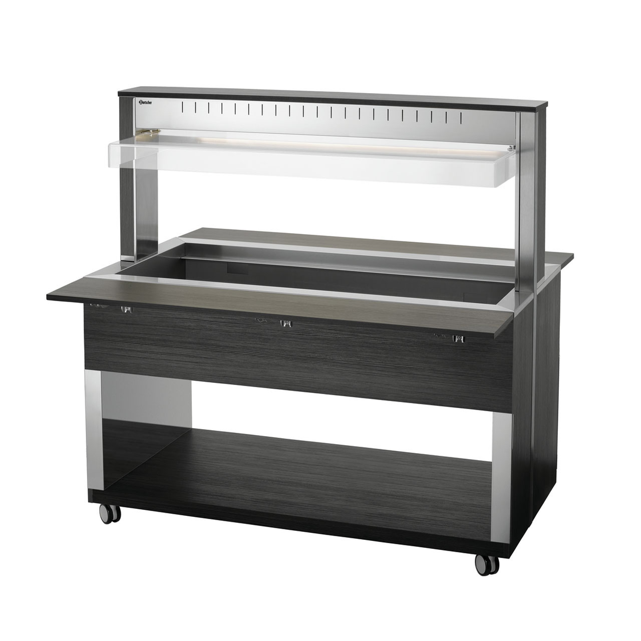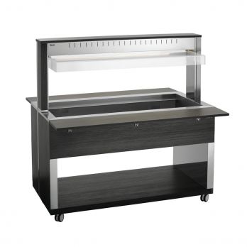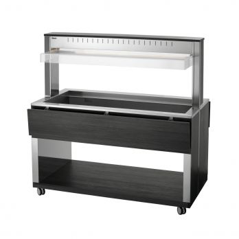Bufetový vyhřívaný vozík pro 4x GN 1/1-200 mm (530 x 325 mm) s hygienickou ochranou a LED osvětlením (lze spínat samostatně). 6x otočná kolečka, 2 z toho uzamykatelná. Dodává se smontovaný. Součástí 4 příčky: D 528, Š 30 mm. Materiál laminované dřevo, nerez, plast. Barva antracit. Parametry: - 1 vodní lázeň z nerezové oceli - výpustný kohout - pro 4x GN 1/1 (530x325 mm), max. do 200 mm (gastronádoby nejsou součástí dodávky) - teplotní rozsah 30 - 90 °C - sklápěcí police na tácy, rozměr: Š 1495 x H 250 mm - LED osvětlení, lze spínat samostatně - hygienická ochrana proti vnějším vlivům - kontrolka ZAP / VYP - spirálový propojovací kabel, délka 1,6 m - 6x otočná kolečka, 2 z toho uzamykatelná Příkon: 3016 kW / 230 V / 50 Hz Rozměr: Š 1495 x H 1250 x V 1510 mm Hmotnost: 133,5 kg